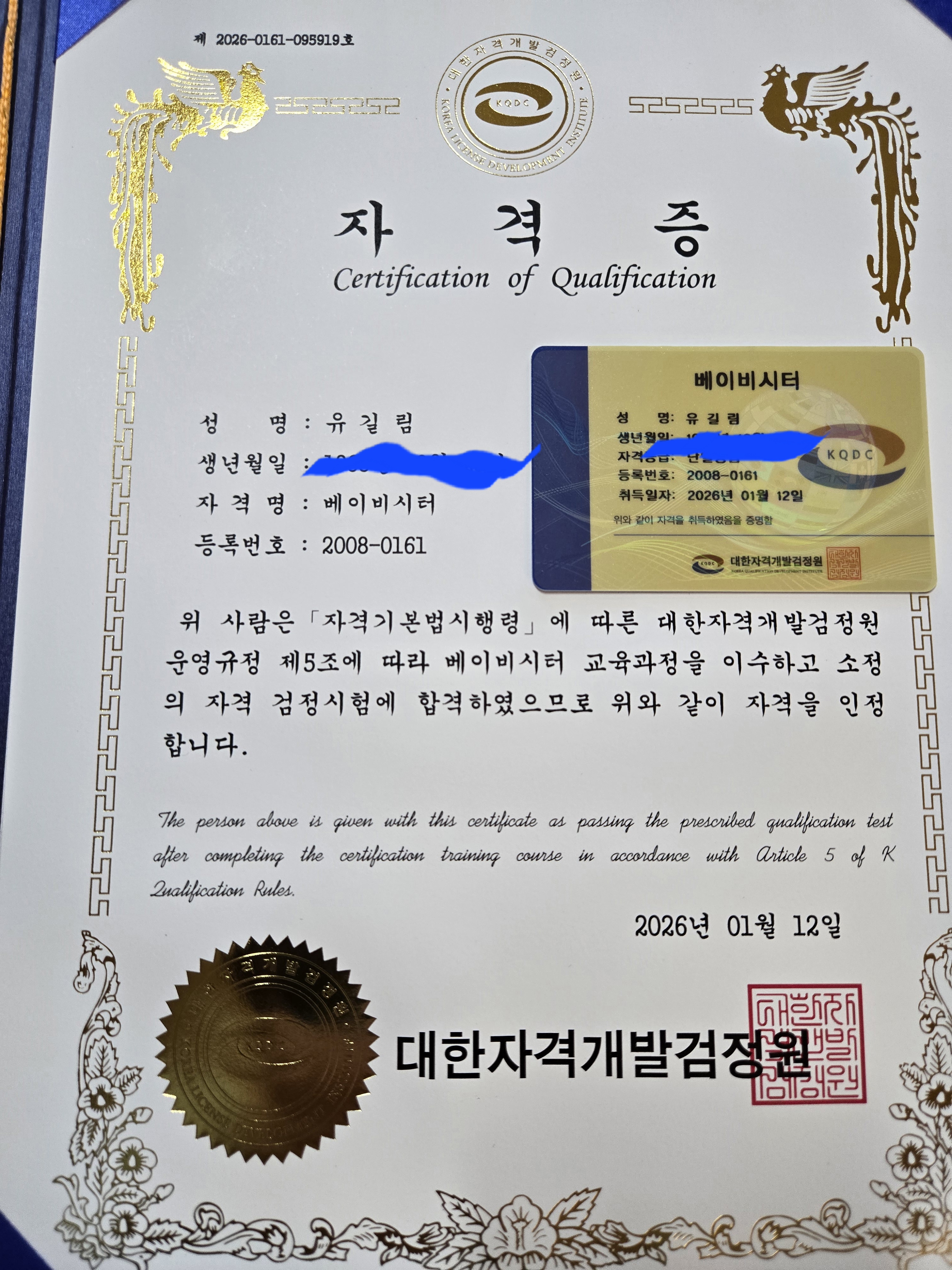 몇달 있음 손주가 태어납니다 손주 봐줄때 도움이 될까 싶어 수강을듣고 베이비시터자격증에 응시했어요 베이비시터 시험후 자격증을 취득하니 뿟듯합니다 내손주도 봐줄수있고 취업도 할수있어 좋습니다