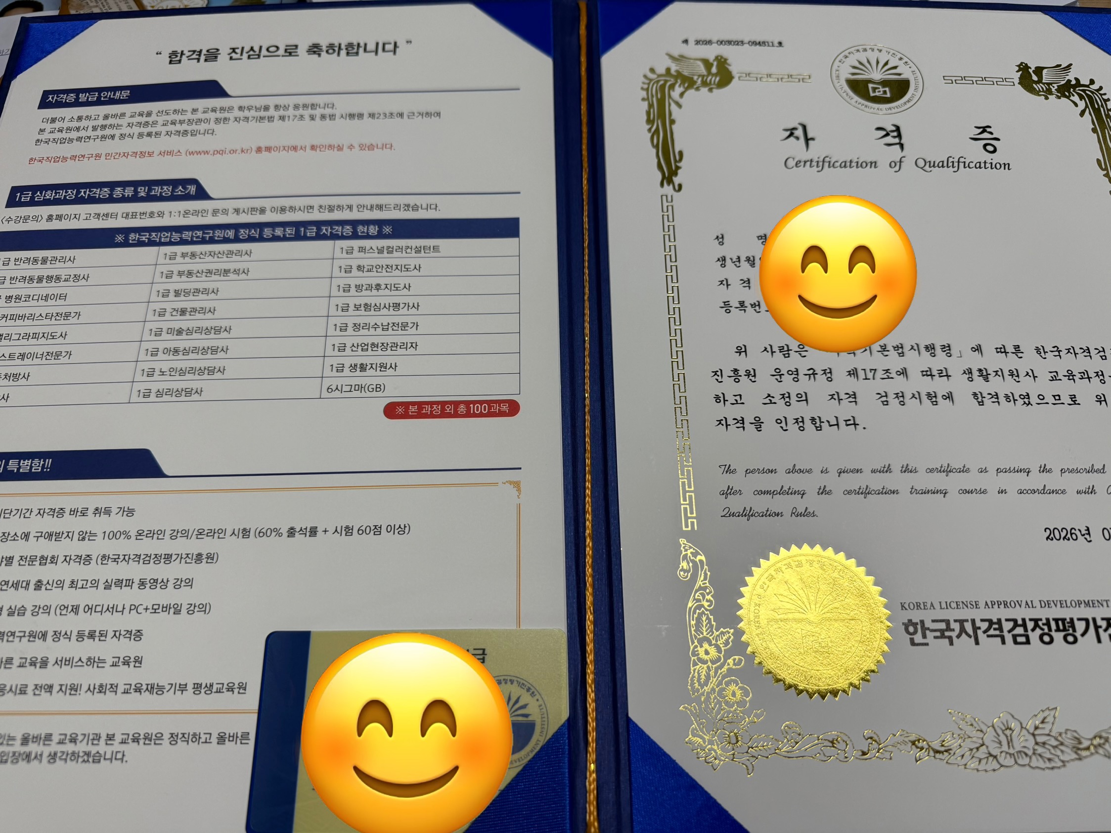 저는 평소에 외모정병이 있는 사람인데요 피부과나 성형외과를 가는일이 있을때면 나도 코디네이터가 되고싶다라는 생각을 자주 했었던거 같아요 꿈을 잠시 잊고 지내다가 병원코디네이터는 자격증을 어떤 과정으로 취득하는지 알아보던 와중 한국자격검정진흥원을 알게되어 유용한 강의들을 들으면서 자격증을 쉽게 취득할수 있었어요 ! 강의에서 다 알려주니 다들 두려워말고 관심있는 분야가 있다면 신청해서 들어보시길 추천드려요:)