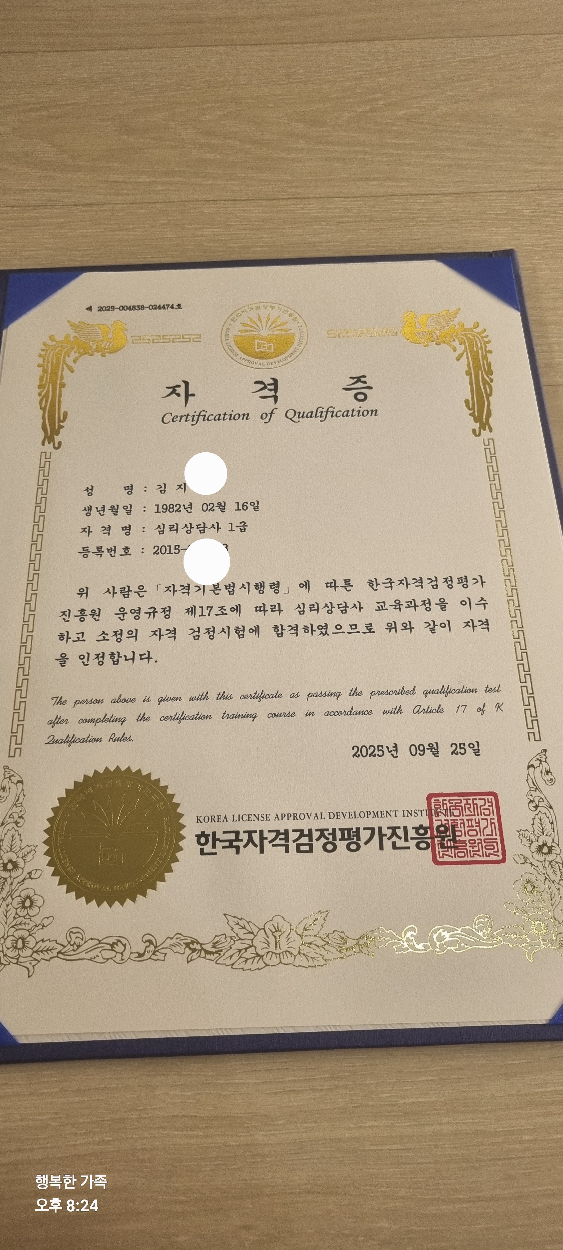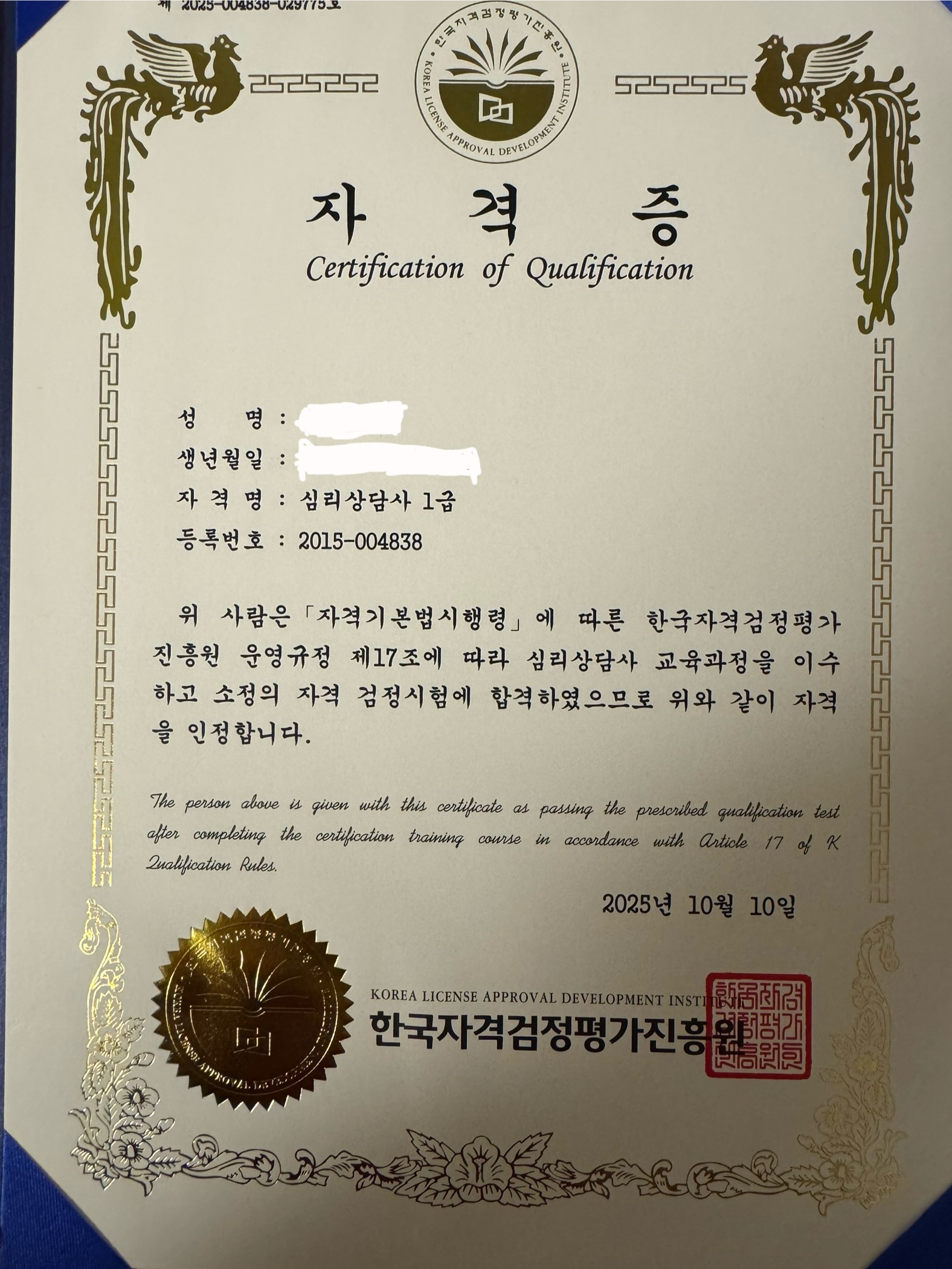 합격한 지는 조금 됐지만 이제서야 후기를 남깁니다 :) 평소에 다른 사람의 고민을 들어주고 상담해주는 걸 좋아해서, 심리상담사 자격증에는 꼭 한번쯤 도전해보고 싶었어요. 온라인으로 영상을 보며 공부할 수 있어서 시간과 장소에 구애받지 않고 준비할 수 있었고, 생각보다 어렵지 않게 자격증을 취득할 수 있어서 정말 만족스럽습니다!