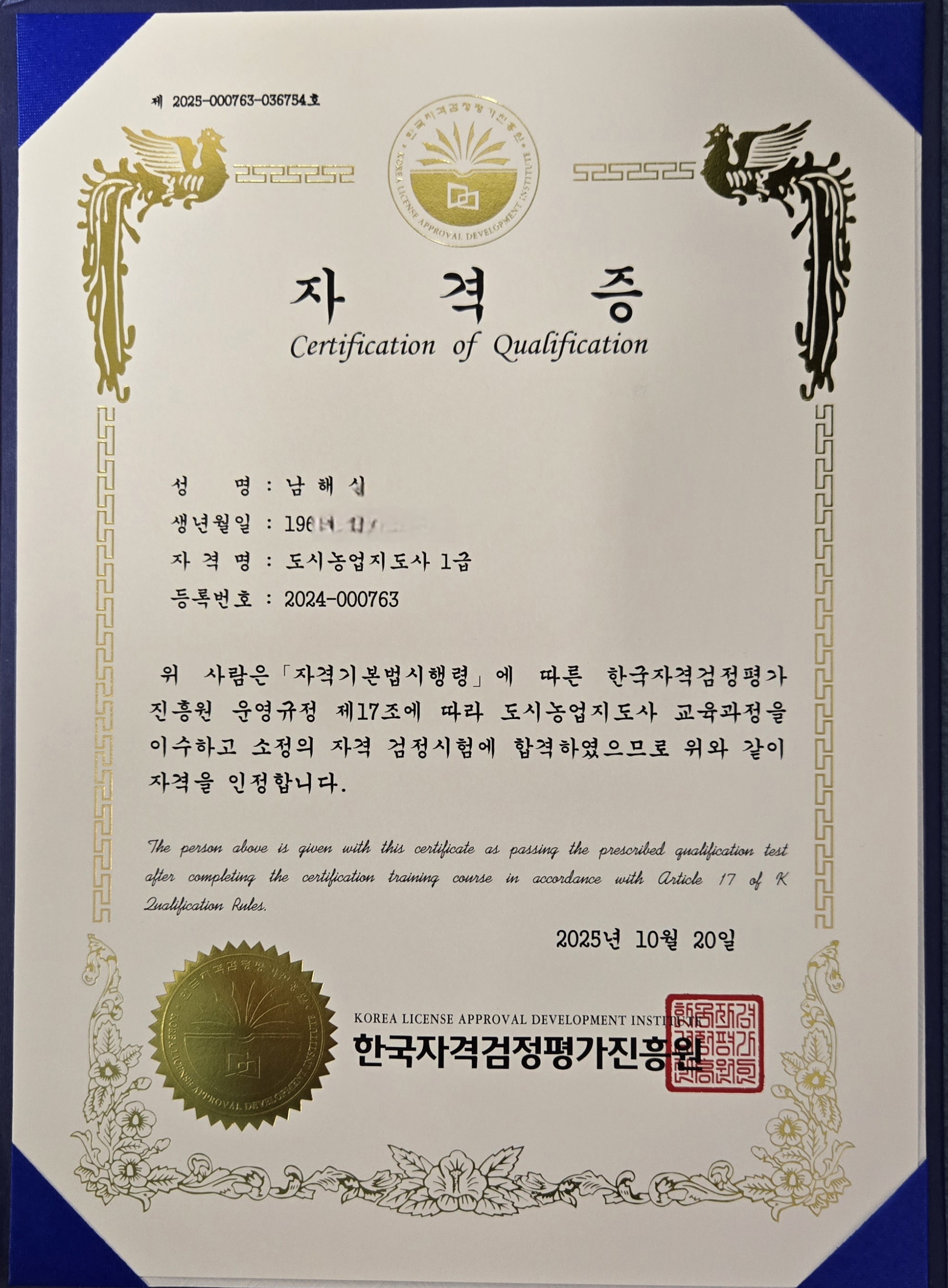 농사에 대한 기본적 지식도 없이 집 주변에 작은 텃밭에 채소를 심어 먹었었는데 도시농업지도사 강의를 수강하면서 많은 지식과 정보를 습득하게 되었습니다. 내년부터는 습득한 지식을 활용하여 제대로 된 농사를 한번 지어보겠습니다.