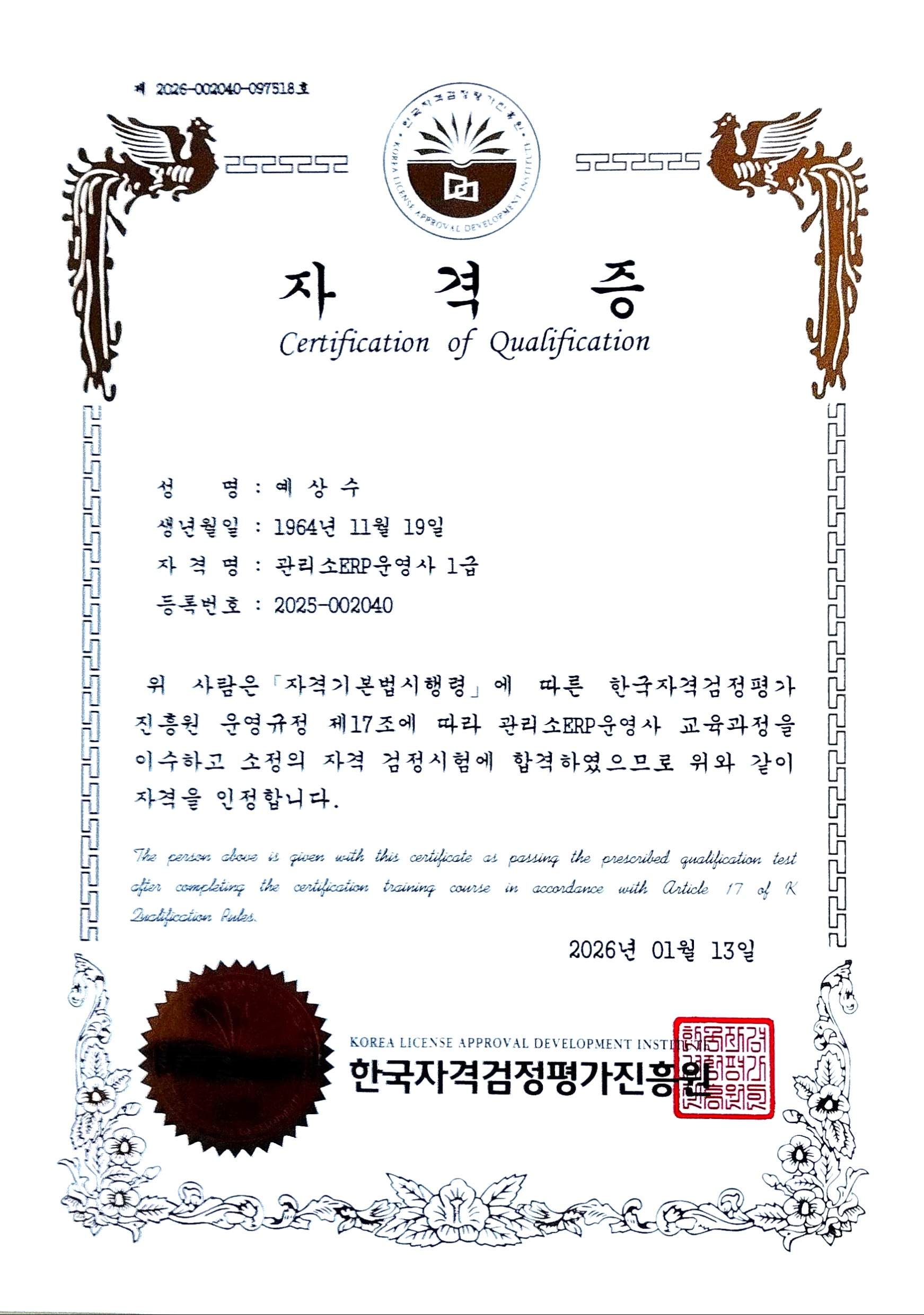 주택관리사 자격증 취득 후에 관리소ERP운영사 자격증을 취득했어요..실무에 많은 도움이 되었으면 좋겠습니다.