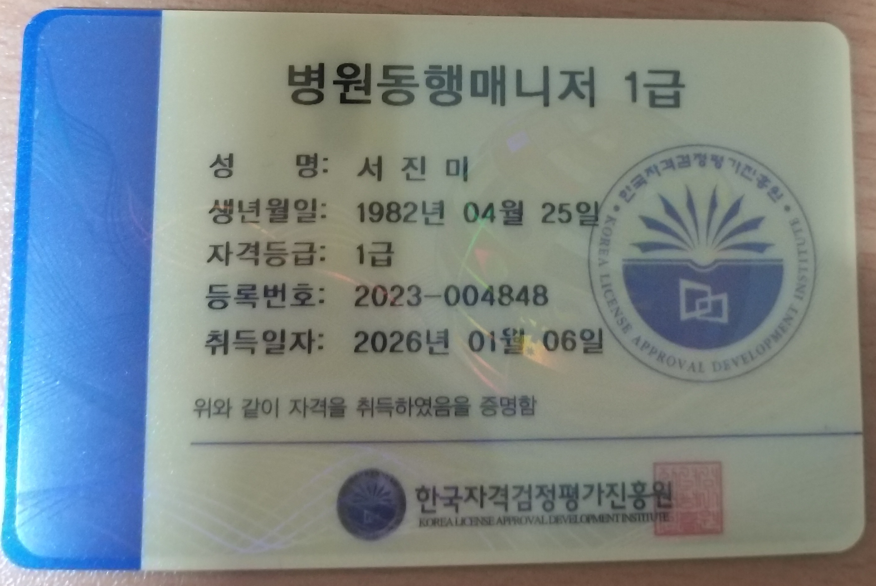 병원동행매니저 자격증 따고 싶었는데 드디어 자격증 생겼네요. 앞으로 기회가 있을 때마다 주위 이웃에게 따뜻한 동행매니저 되겠습니다. 다른 것도 계속 도전하겠습니다^^ 1년 무료패스권좀 선물로 주세요!