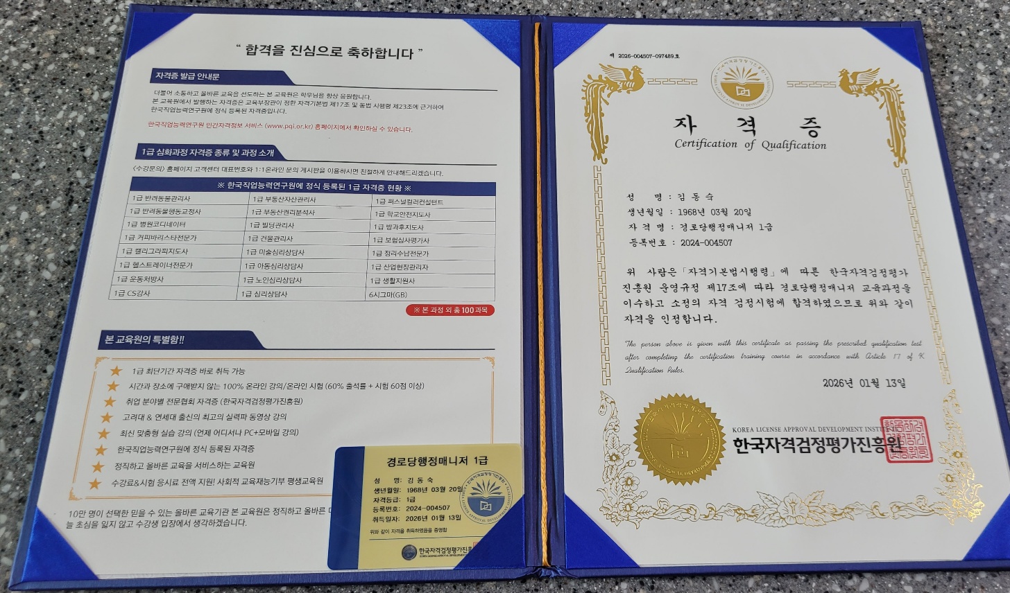 새로운 분야 공부할겸 찾아보다 알게된 온라인 자격증과정. 그동안 비싼돈 내고 시간 맞추느라 고생했던 생각하니 억울할 정도네요 ㅎㅎ 시간장소 구애없이 편하게 강의듣고 쉽고 명쾌한 설명에 몇일 듣고나니 자격취득까지 금방이네요 ^^ 관심있었던 분야들 하나하나 들어봐야겠어요 ^^ 감사합니다