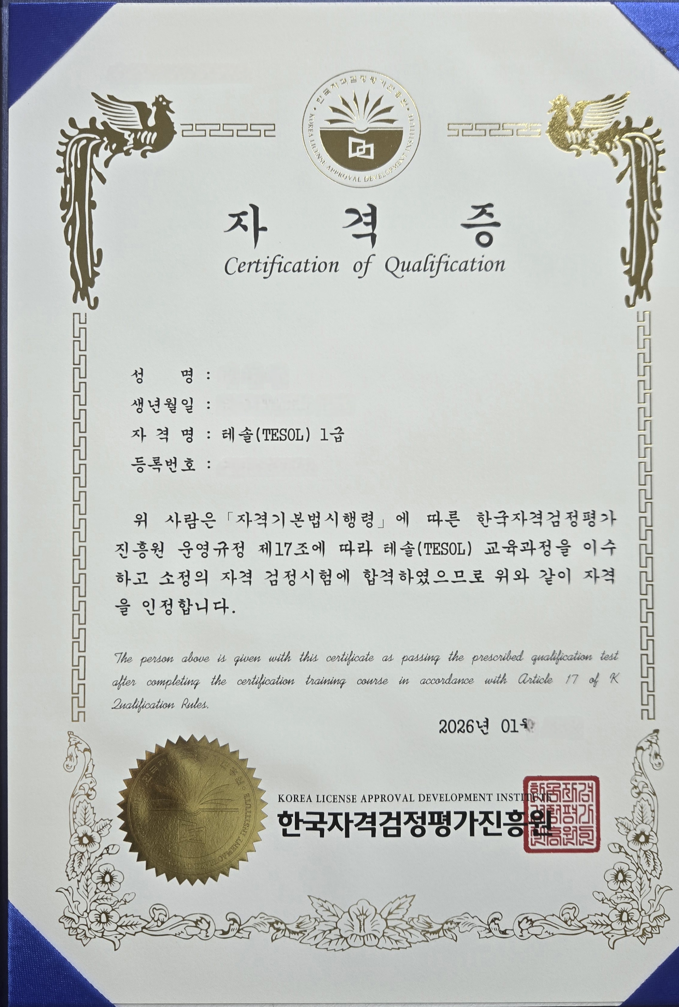 저는 결혼 초반까지 영어강사하던 경력자입니다. 오랜 시간 손놓고, 다시 일을 시작하려는데, 자신감이 조금 떨어져서 테솔자격증 공부를 시작했어요^^ 공부하면서 예전에 대학생때 들었던 이론공부들이 생각나면서, 티칭계획이 세워지더라구요^^ 영어쪽으로 새로이 진입하시는 분들은 다른 영어강의들도 같이 들으시면 도움이 될 것 같아요~ 저처럼 이쪽 계열에 계셨던 분들에게는 짧은 시간에 테솔 자격증 따기에 참 좋은 것 같아 강추드립니다.