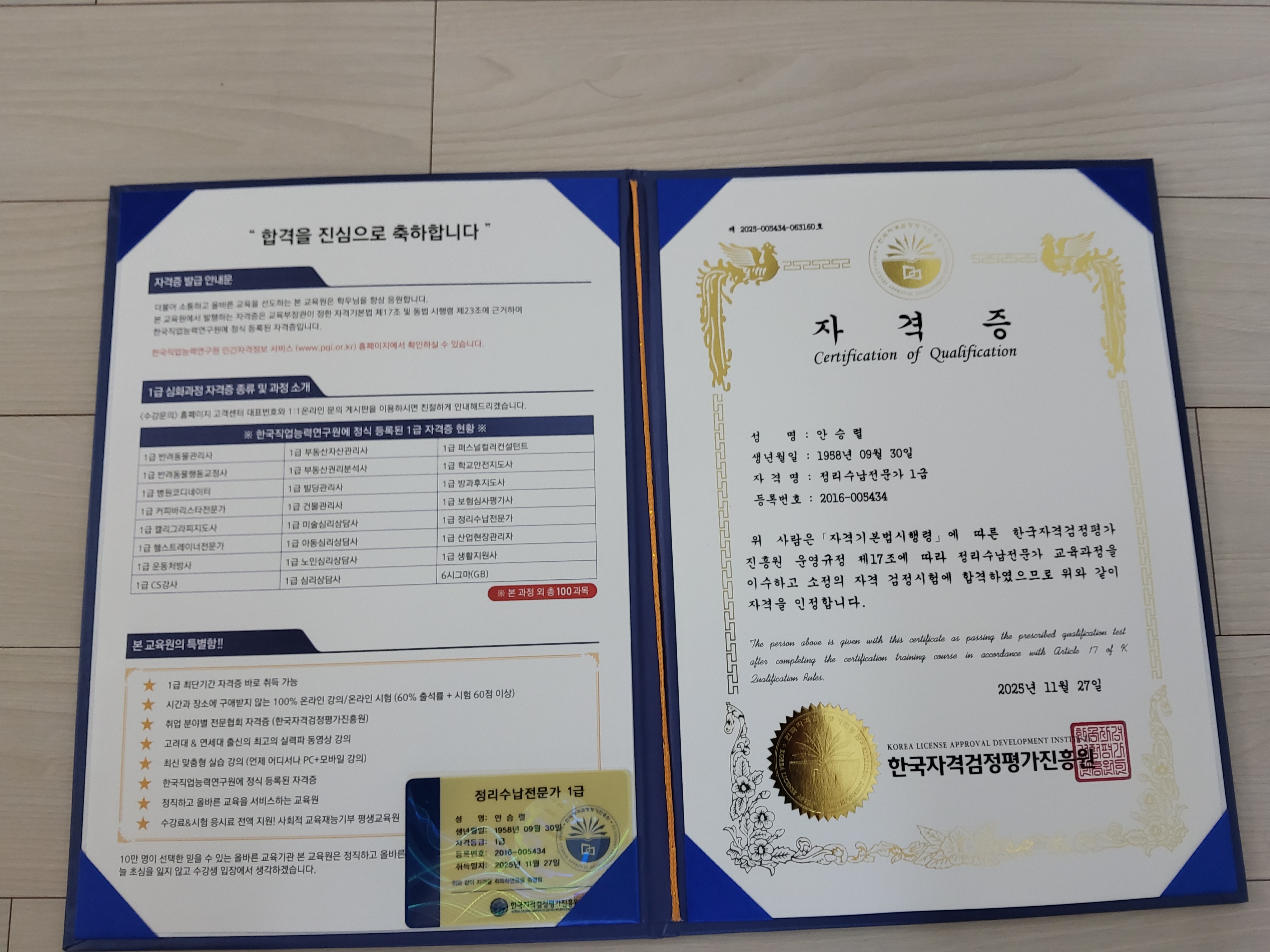 8여년 일하던회사사정으로 그만둔후 평상시 정리정돈을 잘하는 편이라 정리수납1급 시험에 응시. 합격해습니다. 훌륭하신 강사님 덕분입니다. 감사드리고 후에도 정리수납관련일을 할 예정입니다. 다시한번 감사드립니다.