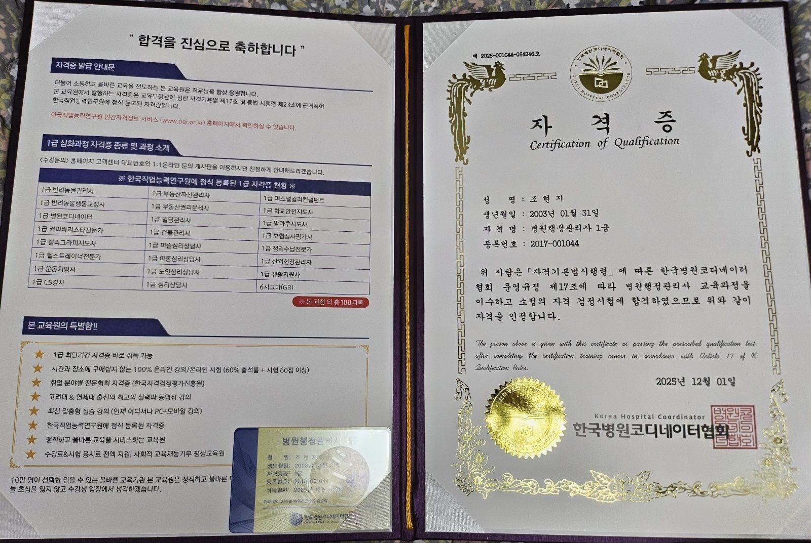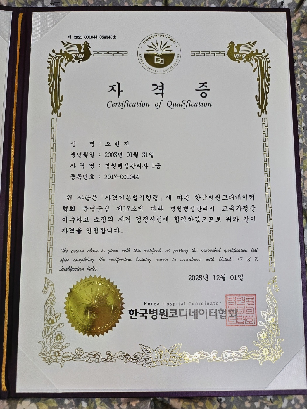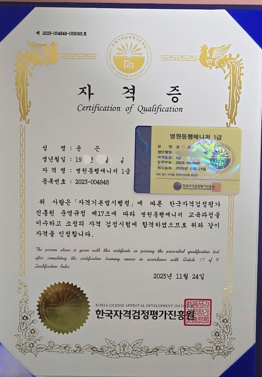 병원 취업에 도움이 되는 자격증이라고 해서 취득했고, 이제 슬슬 취업하려구요 기회 감사합니다~