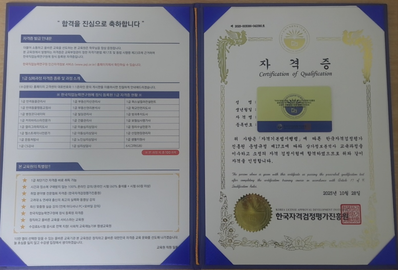 뛰여다녀도 시간이 부족한 저에겐 한국자격검정평가진흥원은 한줄기 빛이였어요.매일 차한잔의 시간으로도 충분히 공부할수있고 자격증까지 받을수 있어서 너무 좋아요.현재까지 5개의 자격증을 취득했는데.자격증 받을때마다 너무 뿌듯하고 자신심이 생겨나네요.앞으로도 열심히 공부하고 계속도전할겁니다.마지막 감사하단말 꼭 전하고 싶어요.강추예요.강추!