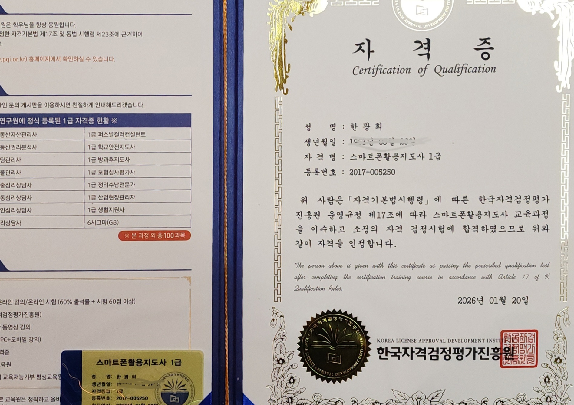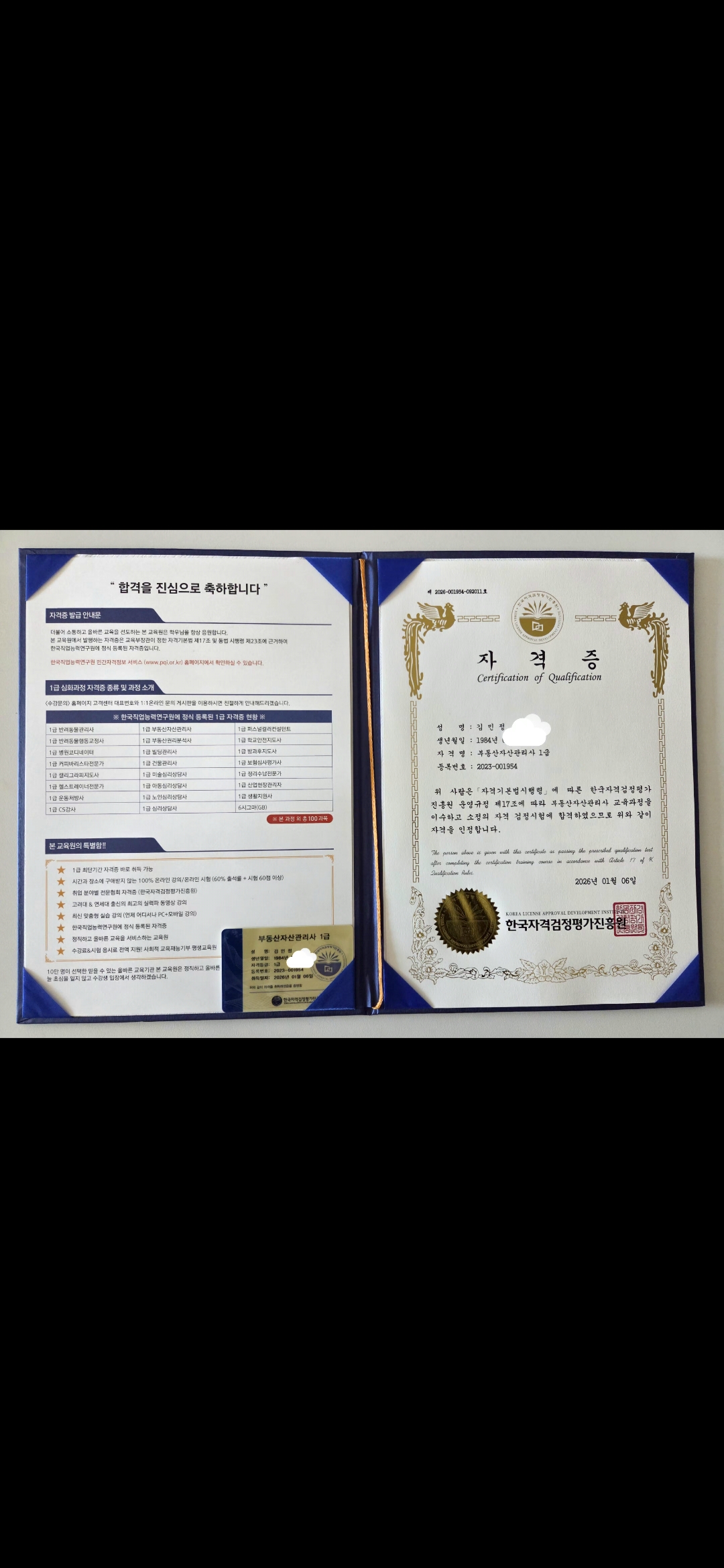 안녕하세요. 2025년에 제36회 공인중개사 자격증을 취득하고 실무교육 과정도 수료하였습니다.아직 개설등록은 하지 않은 상태에서 우연한 기회로 한국자격검정평가진흥원의 다양하고 유익한 자격증 과정이 있다는 사실을 알았습니다.공인중개사 자격증 공부와 일맥상통하는 부분이 많이 있어서 이해하기 쉬웠고 교수님의 말씀이 귀에 쏙쏙 들어와서 도움이 많이 되었습니다.공인중개사 실무교육에 버금가는 유용한 강의였습니다.훌륭하신 교수님의 강의와 더불어 자격증 취득까지 가능하니 강력추천합니다.
