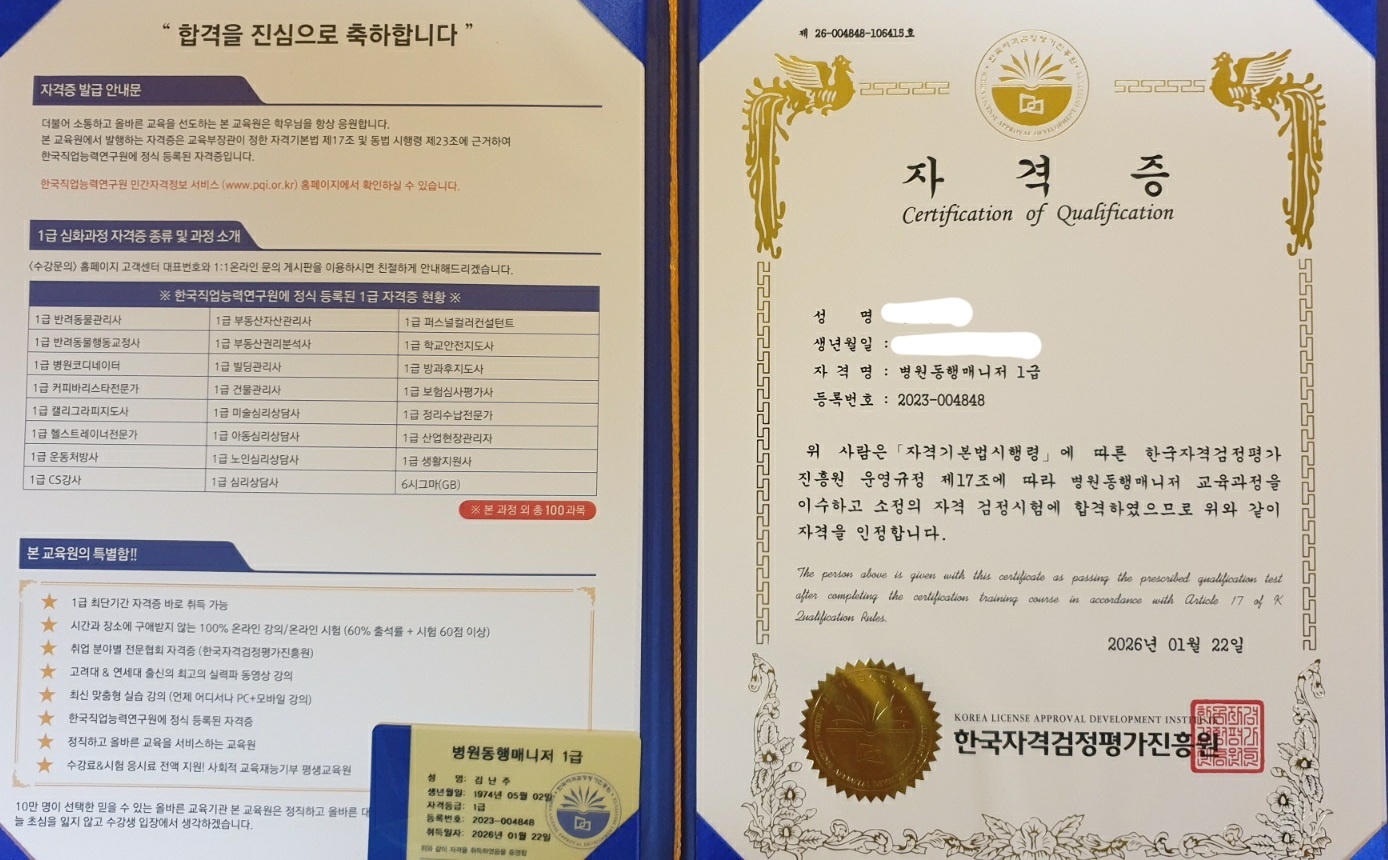 아버지를 24년 폐암때문에 여자 간병보다 남자간병 그리고 3주마다 동행 나한테 정말 어려웠지만 둘만의 끈끈한 믿음을 만들어준 일이다 2년 그전부터 병원동행이란건 들어봤다 관심이 너무 많아 도전하게 되고 너무나 조은 자격증을따게되어 좋다 둘러보니 너무나 배울자격증들이 많은것 같다 화이팅
