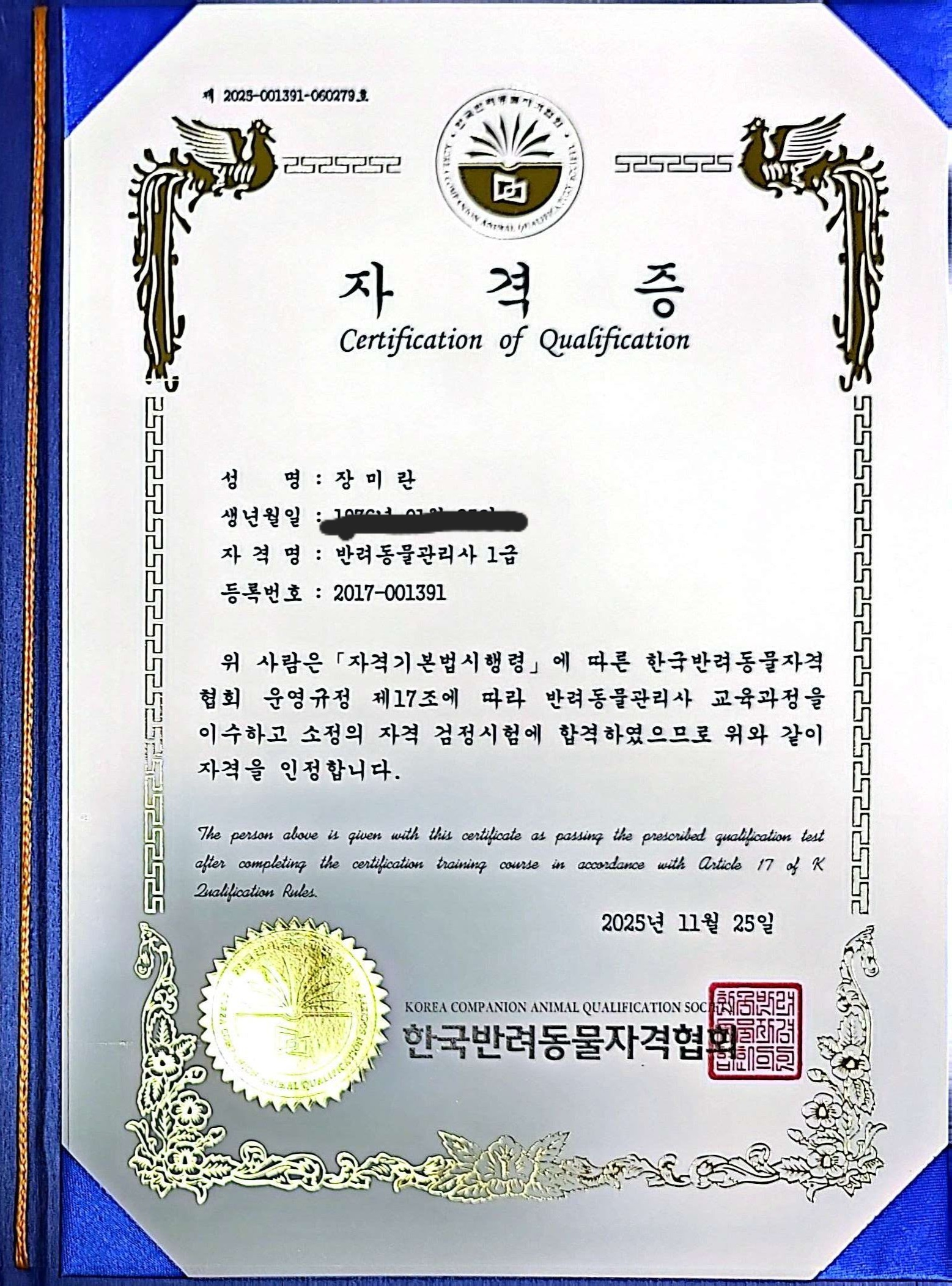 애견을 좋아하는 사람으로 반려동물관련일을 해보려고 자격증에 도전해보았습니다. 강어도 알차고 귀에도 잘들어오고 합격하고 보니 넘 감격스럽네요