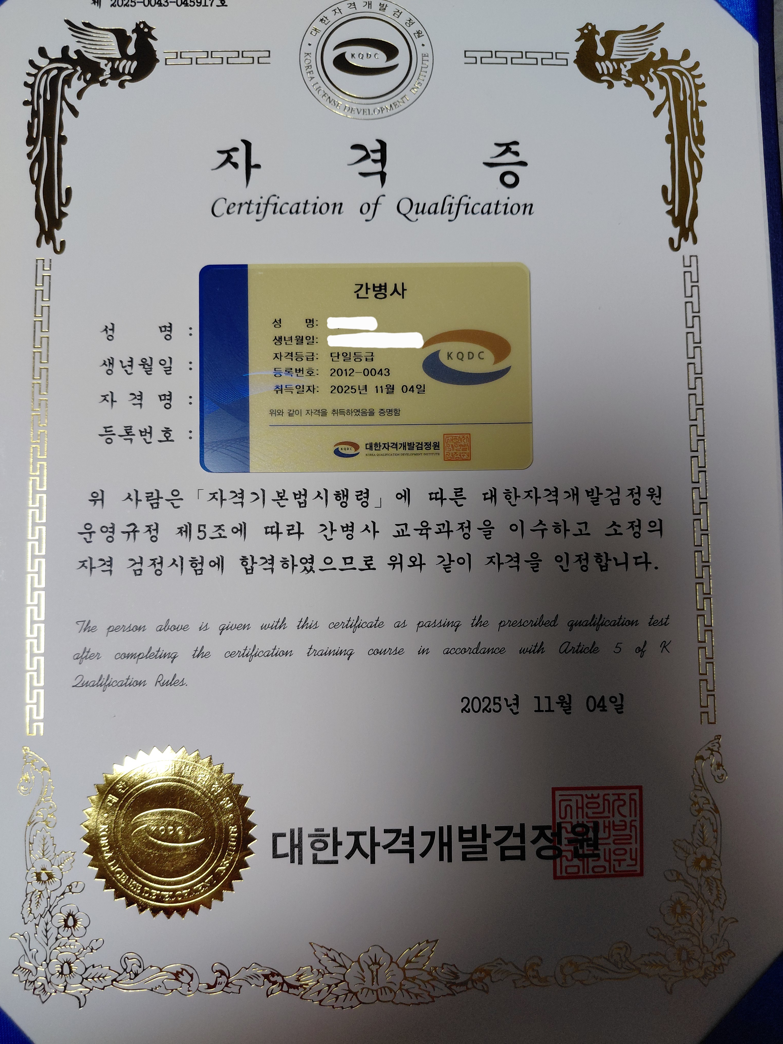 친정 엄마가 아파서 간병사 관심이 생겨 공부를 하게 됐습니다 합격하게 돼서 무지무지 뿌듯하네요