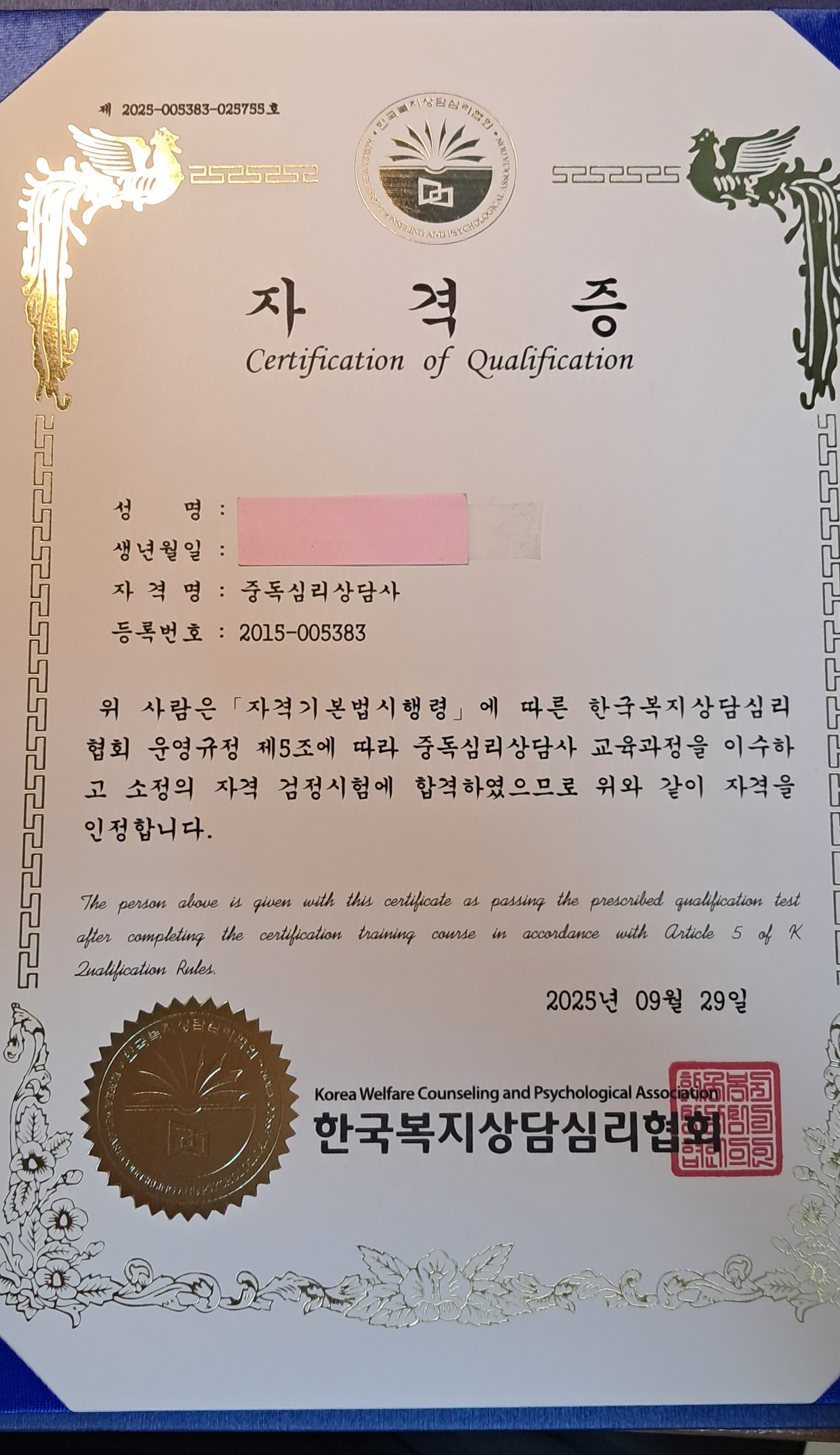 중독이라는 분야에 관심이 있어 시작했는데 처음에 생각했던 것 보다, 강의가 내용도 알차고 도전할 수 있도록 잘 이끌어 주었습니다. 수강 자체가 매우 유익햤고 자격증을 받아보니 정말 뿌듯함을 느낍니다. 좀 더 심리관련 자격증에 도전해보고 싶은 마음입니다.