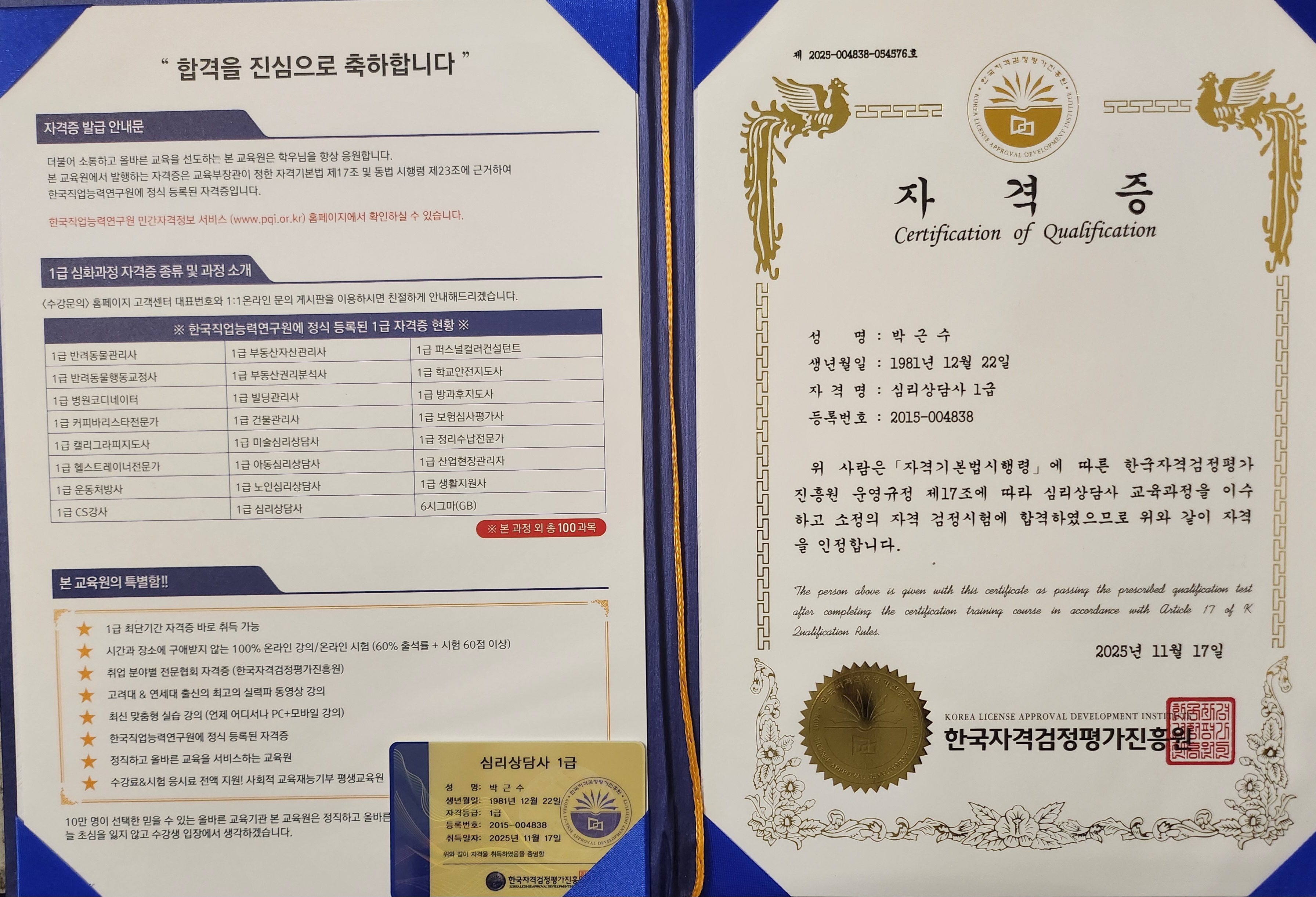 마음만 있다가 노후대책으로 아주 쉽게 자격증을 취득 했습니다. 사람일은 모르는거라 다른 자격증도 추가로 공부중입니다.