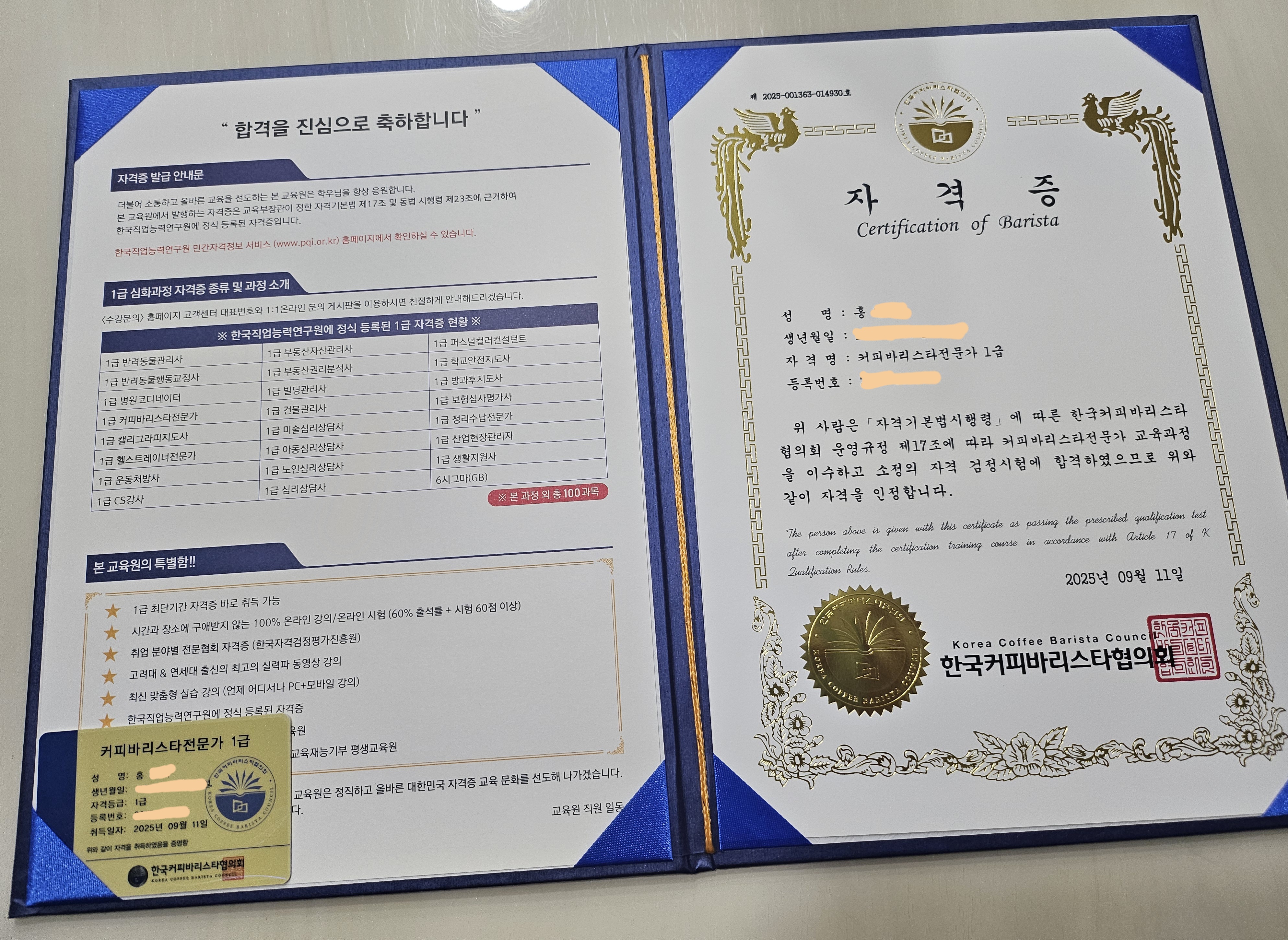 바리스타 자격증 취득하고 싶어 오프라인에서 잠시 강좌 들었는데, 시간이 없어 중단하게 하게 됐습니다. 그런데 우연히 이곳을 알게 되서 어렵지 않게 자격증 취득하게 되서 너무 감사 드립니다~ 그 외에도 필요한 자격증 취득하고 있어요.. 미래를위한 준비^^
