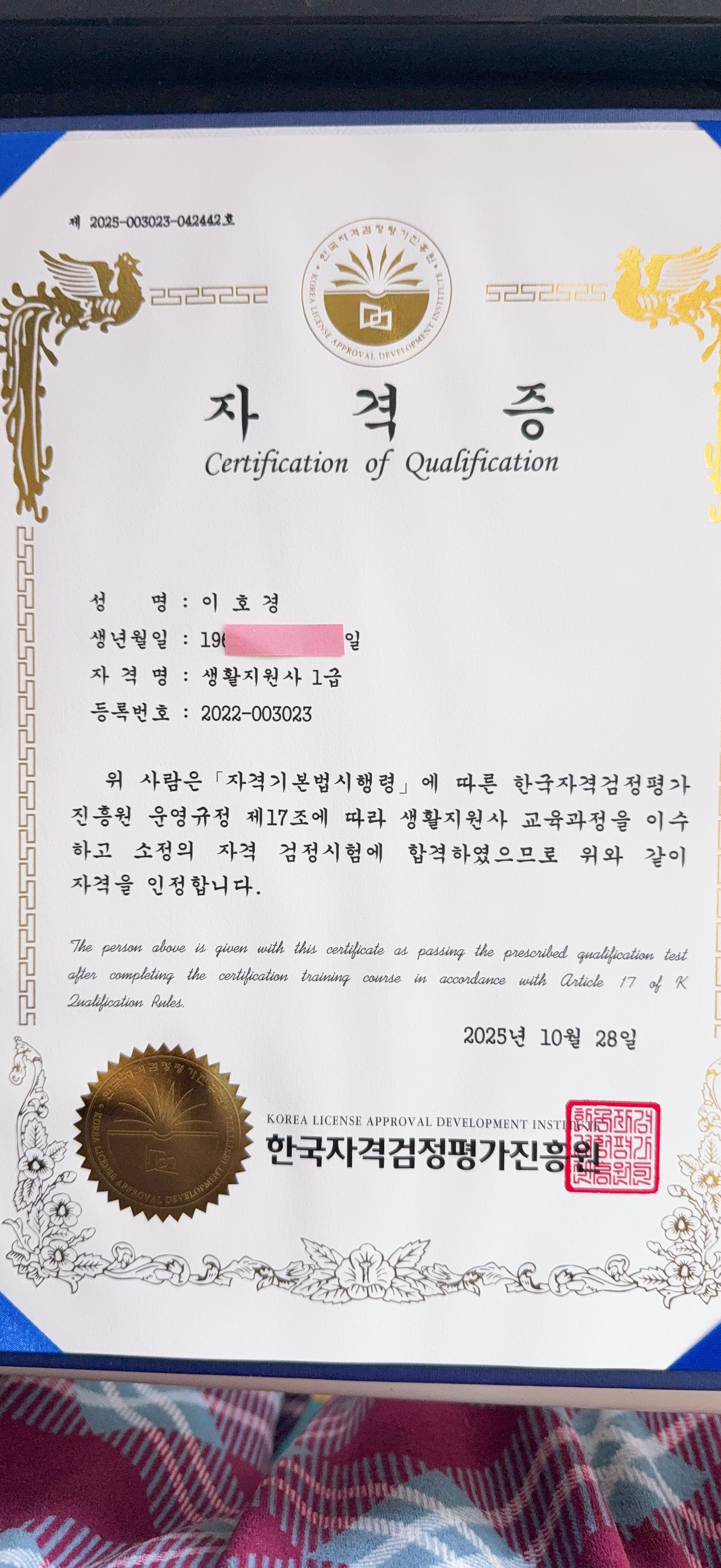 요양보호사 자격 안따고 이걸로 대체할수있다고 해서 땄습니다 강의들으면서 자신의 노후생활에도 도움이되겠네요. 취업도 노력해보겠습니다.