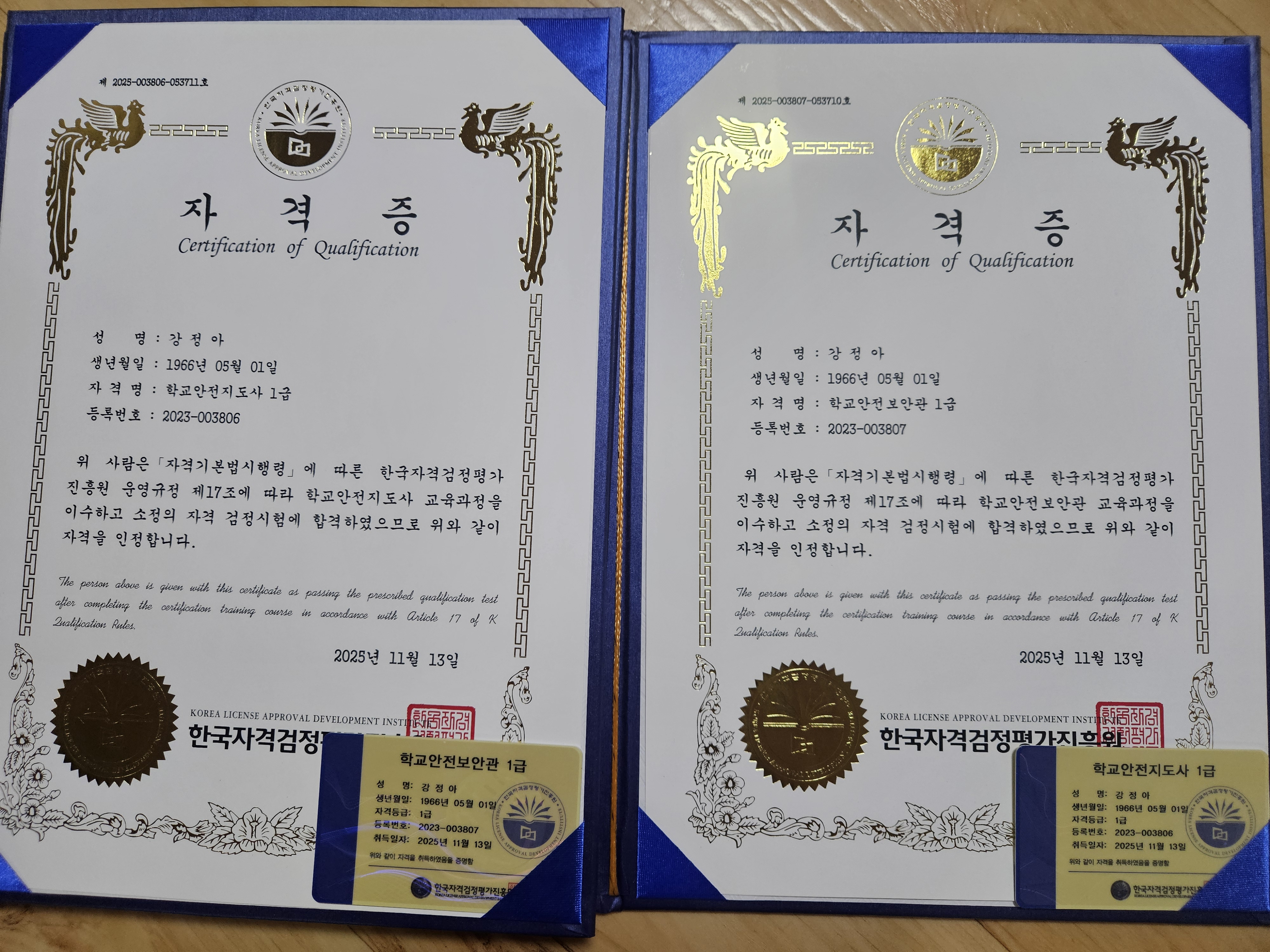 퇴직이후 무엇을할것인지 고민하고 있던때 지인이 교통안전지도사를 하시면서 보람도 느끼고 노후를 집에서 무의미하게 보내지않고 수입도 얻고 일석이조의 삶을 사시는 모습을 보고 내년 퇴직을 앞두고 자격증을 취득하게 됐습니다 아울러 보안관지도시도 취득했고 관련이 있겠다 싶어서 교통안전지도사도 취득했어요 또한 앞으로 고령화사회로 노인생활지도사도 도움이 되겠다 싶어서 취득했고,경로당행정매니저도 취득할까합니다 자격증이 제미래에 꼭! 도움이 되었으면 합니다 하나.둘 취득하다보니 자꾸 다른 자격증도 도전하고 싶어지고 보람차고 무엇인가 준비했다는 뿌듯 함이 행복합니다.♡