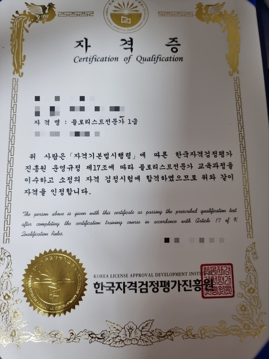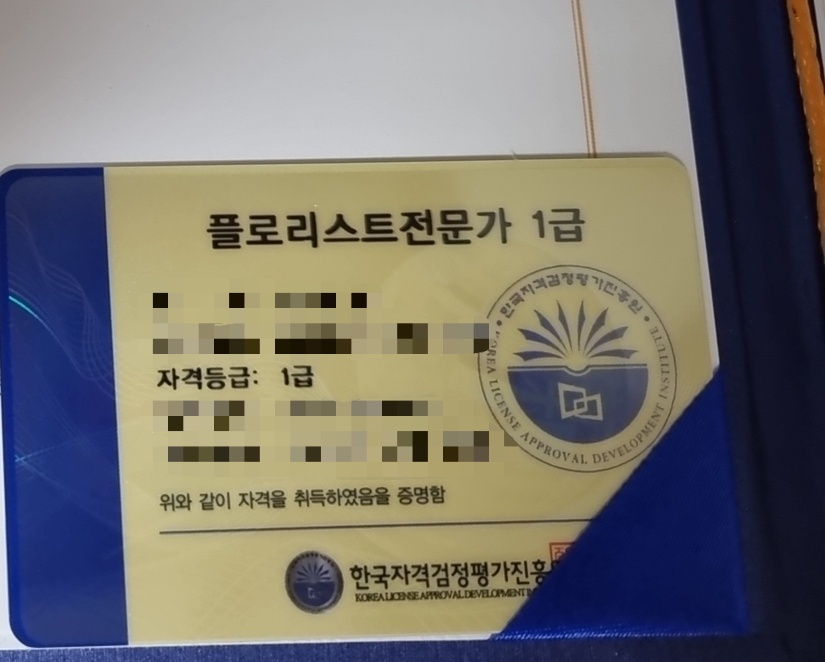 플로리스트라는 직업이 항상 궁금했는데, 꽃 관련 해서 너무 많은 것을 알게 되어 너무 좋았어요. 흥미로웠고, 선생님께서 재미있게 잘 알려주셔서 잘 했던 것 같아요. 꽃 관련해서 배우고 싶다는 생각을 몇년 전에 잠깐 했다가 학업이 더 중요해서 접었었는데; 이렇게 단기간에 할 수 있게 돼서 너무 좋아요. 즐거웠어요! 감사합니다!~ 그리고 시험에서 살짝씩 헷갈렸지만 잘 돼서 너무 좋아요 졸업장느낌?으로 자격증이 왔고, 카드형태의 자격증이 하나 더 왔는데 너무 영롱하고 멋있네요! 감사합니다. 잘 보관할게요. 일단 놓을 곳이 없어서 벽에 기대놨어요. ㅎㅎ
