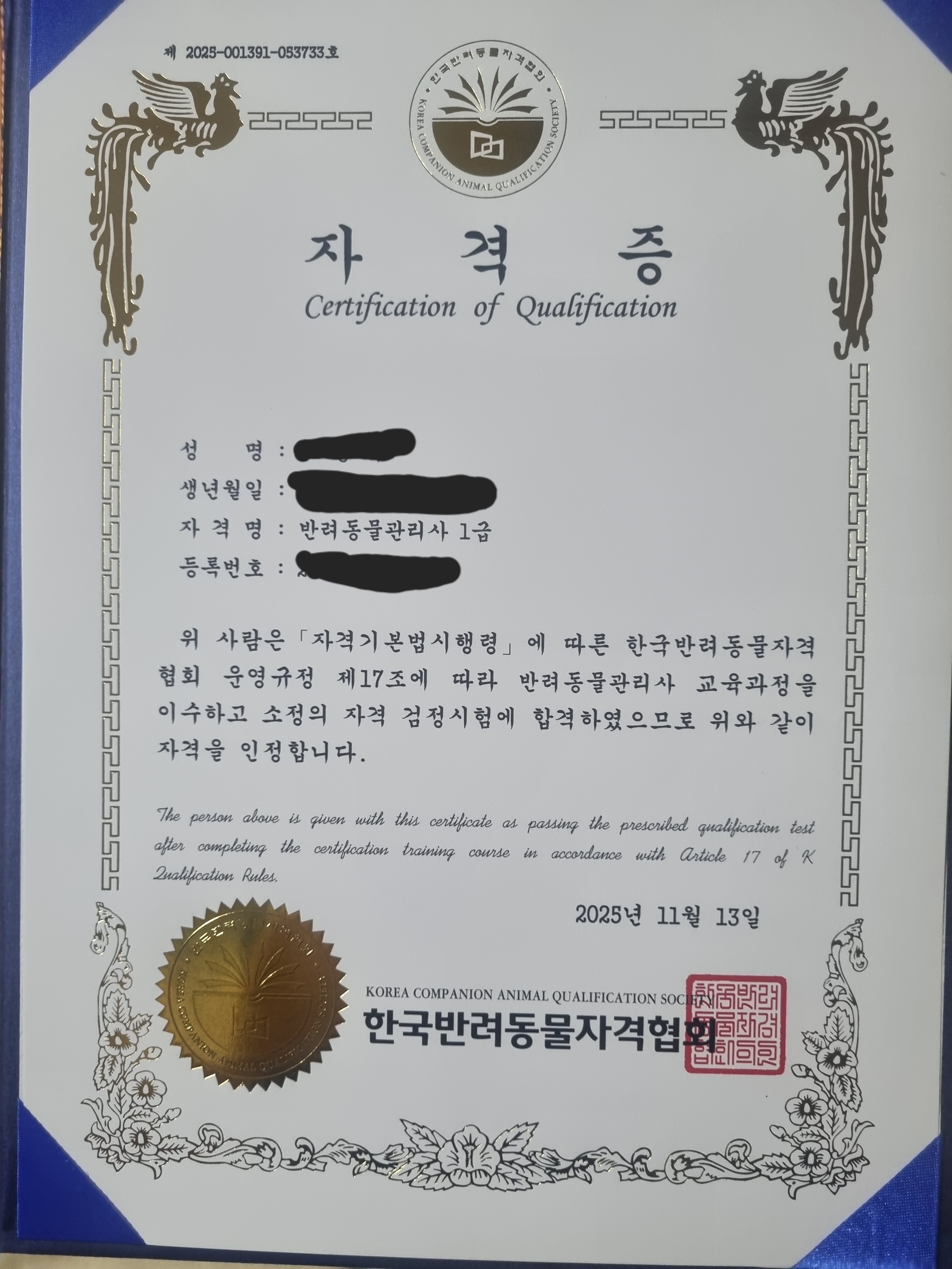 현장에서 바로 일을 할려고 자격증을 준비한게 아니라 저희집에 반려견을 키우고 있다 보니 동물에 대해서 알고 싶어서 도전하게 되었어요.교수님께서 설명도 잘하시지만 이해 하기 쉽게 말씀해 주셔서 머리 속에 쏙쏙 잘 들어 오더라구요.진즉 배워 볼걸 후회 했네요.그럼 울강쥐 잘 키울 수 있었을텐데 요즘은 반려견 반려묘를 키우시는분들이 많다 보니 무조건 예쁘다고 키우는것 보다는...이렇게 공부를 하면서 반려견에 성향을 알면 선택부분에서 많은 도움이 될것 같고 사람처럼 사춘기가 있는 것처럼 반려견도 사회화기 시기가 있어서 8주~12주에 잘 보내야 한다고 하더라구요 그럼 유기되는 경우도 적지 않을까 싶습니다.강의 넘 잘들었습니다.만약 취업을 하게 된다면 다시 한번 숙지해서 좋은 관리사가 되어야 겠다는 생각이 듭니다 감사합니다^^