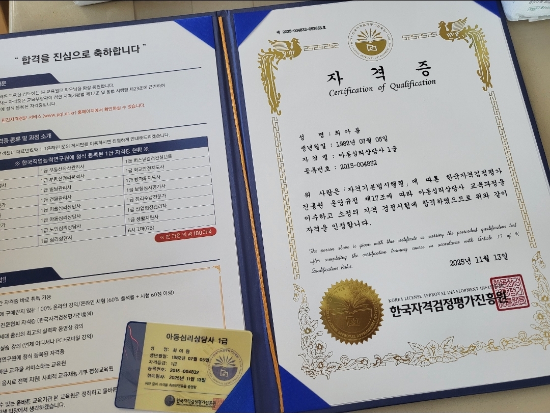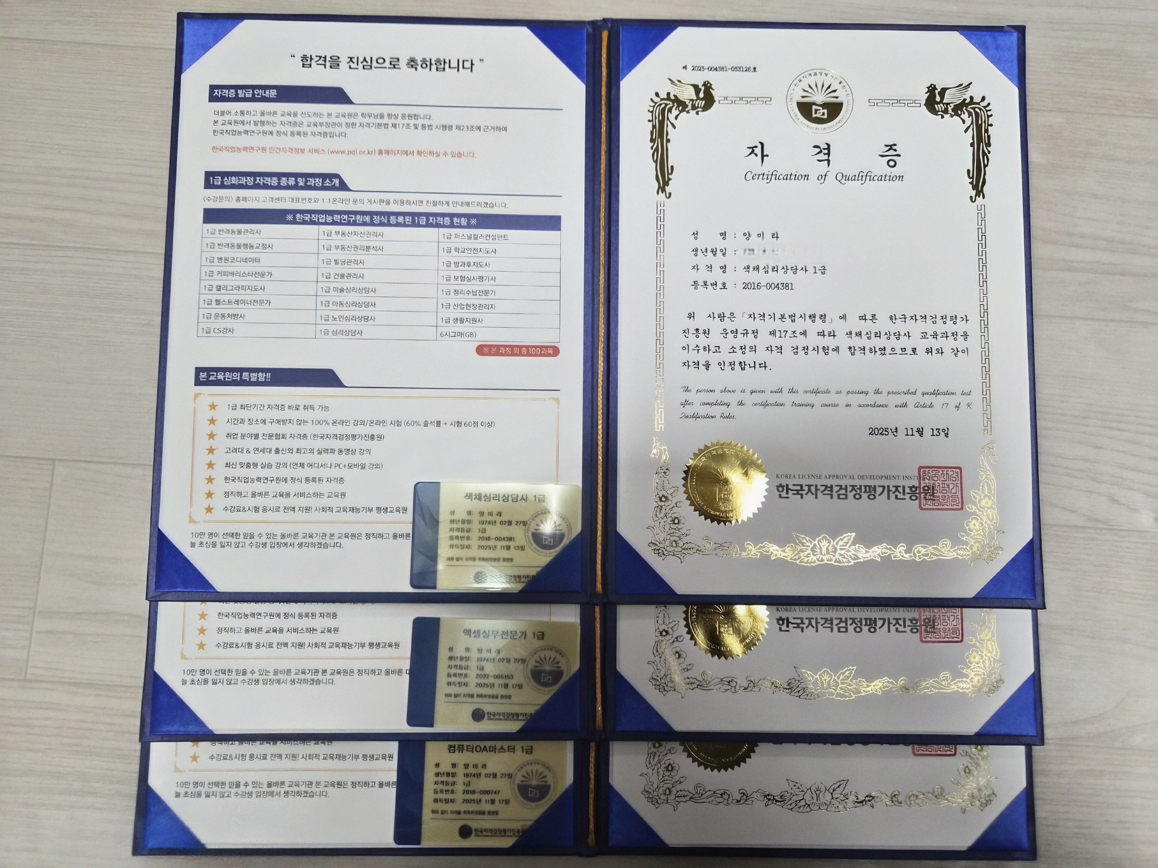 아이들을 가르치는 일을 하고 있어서 도움받고자 좀 더 공부하는 마음으로 시작하였는데 너무나 많은 걸 알게 되었고 이렇게 자격증까지 받게되어 너무나 기쁩니다. 감사합니다^^