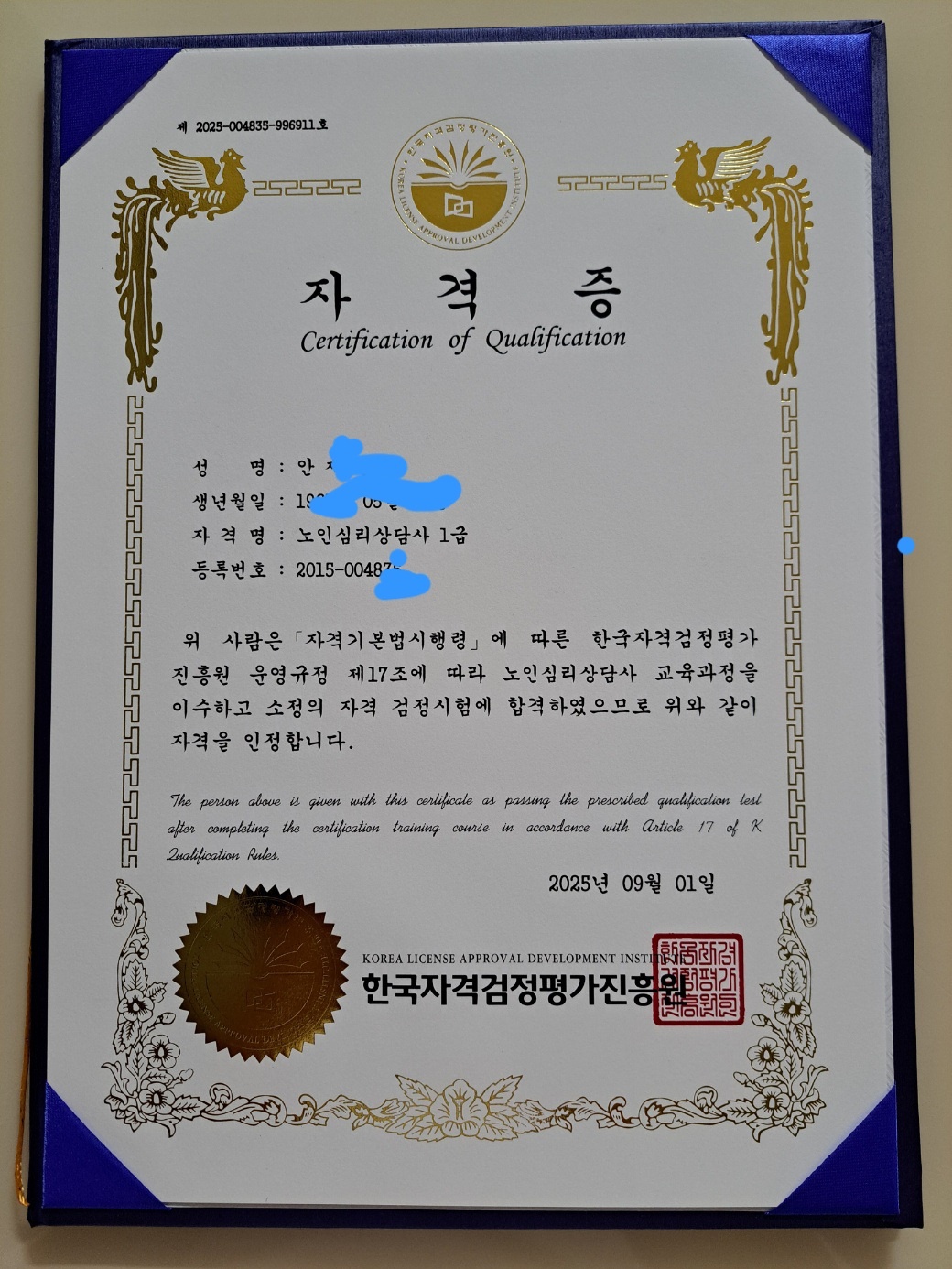 5월에 요양보호사자격증 취득하고 요양원에서 근무중입니다. 어르신들 심리를 조금이라도 이해하고 성심으로 돌봐드리고 싶어서 무엇을 할까 생각중 자격증 생각을 하게되었지요. 강의 수강중 많은 도움이 됐고 자격증까지 취득하니 스스로가 너무 대견하고 어르신들도 조금 더 이해하게 되었어요. 다른 자격증도 도전해 보려 합니다.