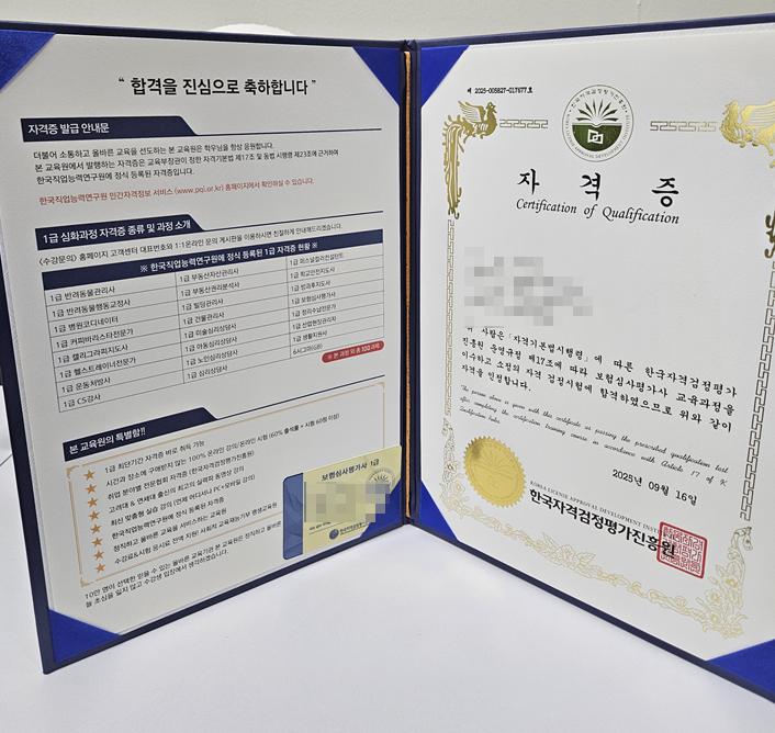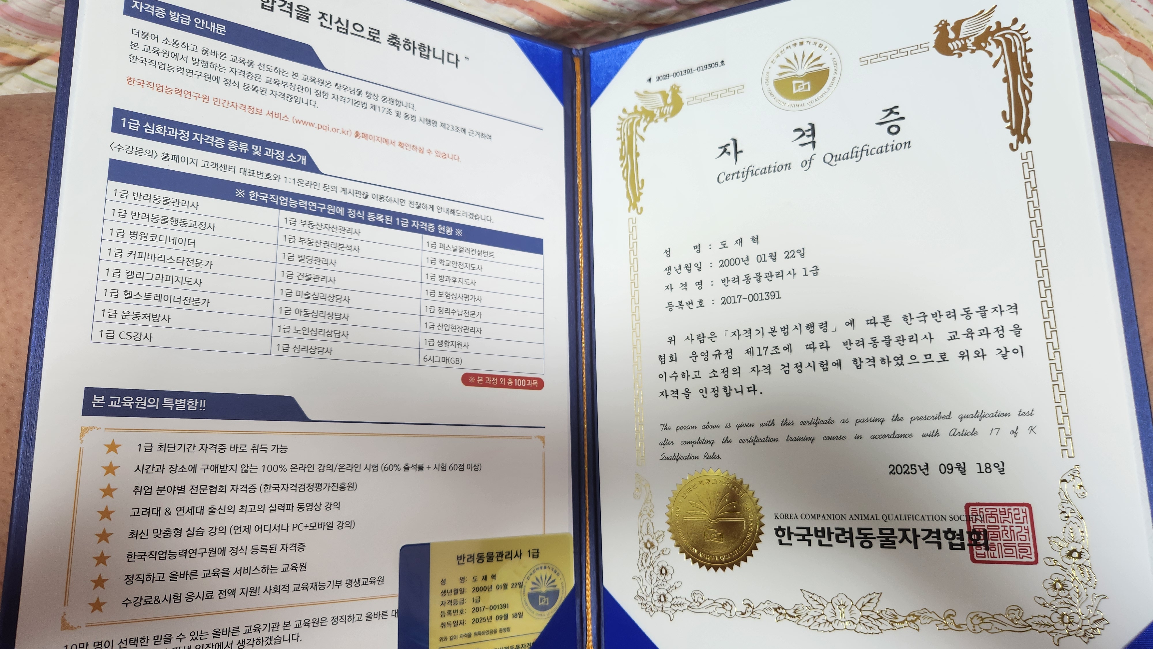 와 이제 수시원서도 끝났고 1학기성적도 다 마감되서 학교에서 틈틈히 공부했는데 자격증을 받고나니깐 너무 실감이 안날정도로 기뻐요! 반려동물 유치원 교원이 되고싶다는 생각을해서 대학도 반려동물학과로 넣고 자격증까지 공부하니깐 제 꿈에 한발자국 더 다가간느낌이에요 앞으로도 반려동물과 관련된 자격증 많이 공부하고 따볼려고요! 강의도 쉽고 친절하게 되어있어서 즐겁게 공부할수있었어요 정말 감사합니다!!