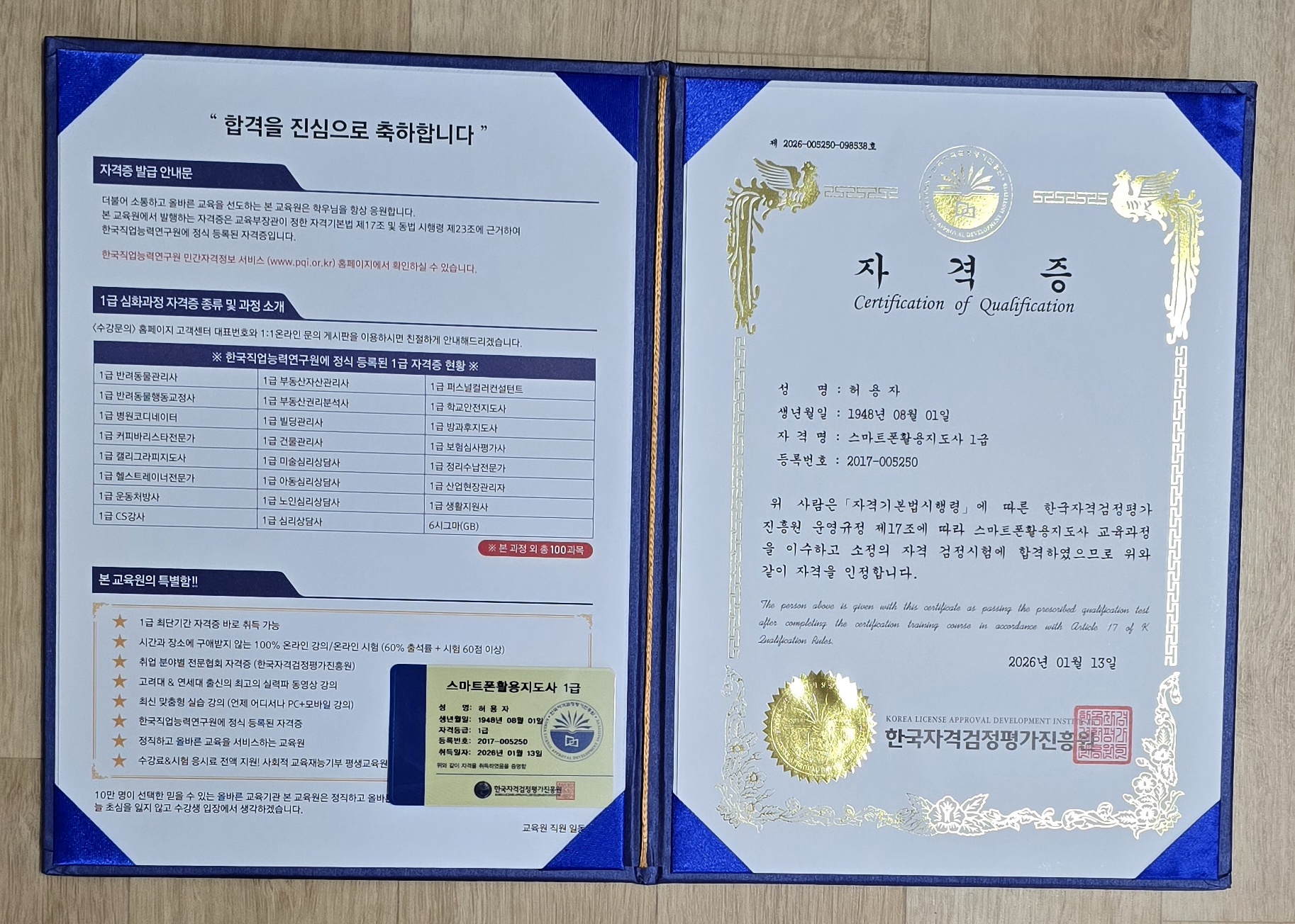 스마트폰 활용지도사 1급 합격했습니다 감사합니다.