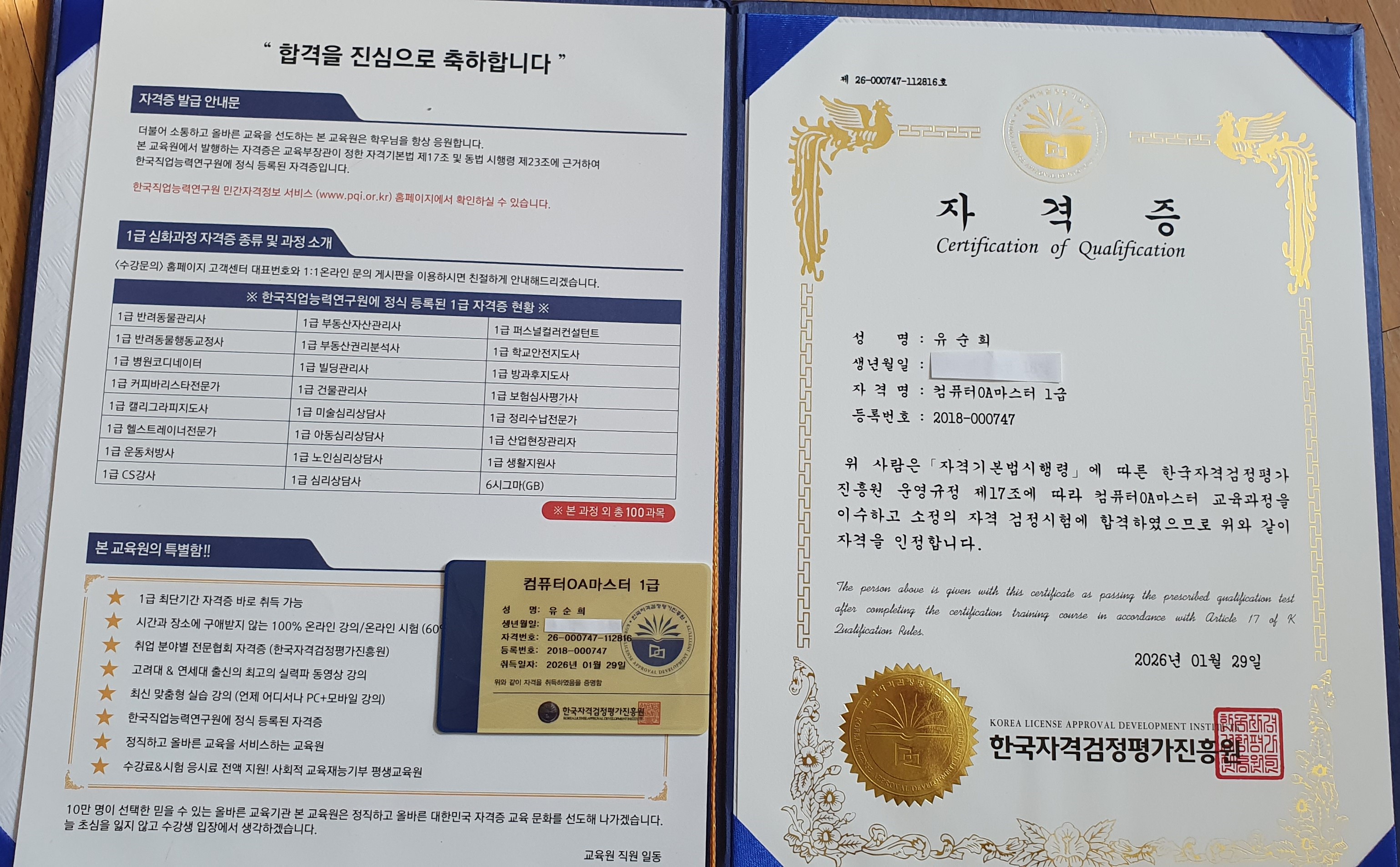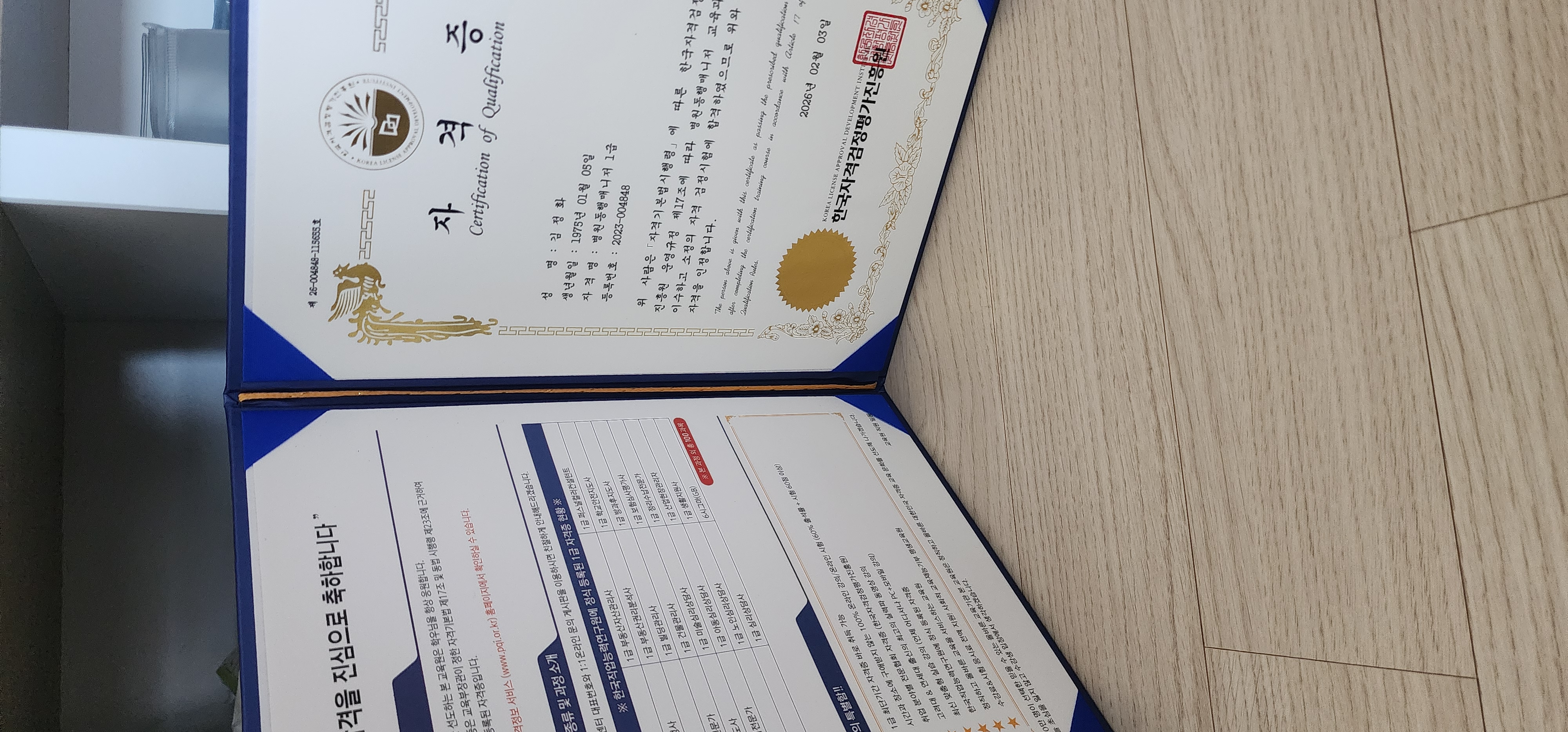 아직 직장을 다니고 있지만, 나이도 있고 ~ 퇴사 후 진로를 고민하다 자격증 먼저 취득했어요. 자격증 취득뿐 아니라 지식도 쌓을 수 있어서 너무 좋네요. 교육이 유익합니다.