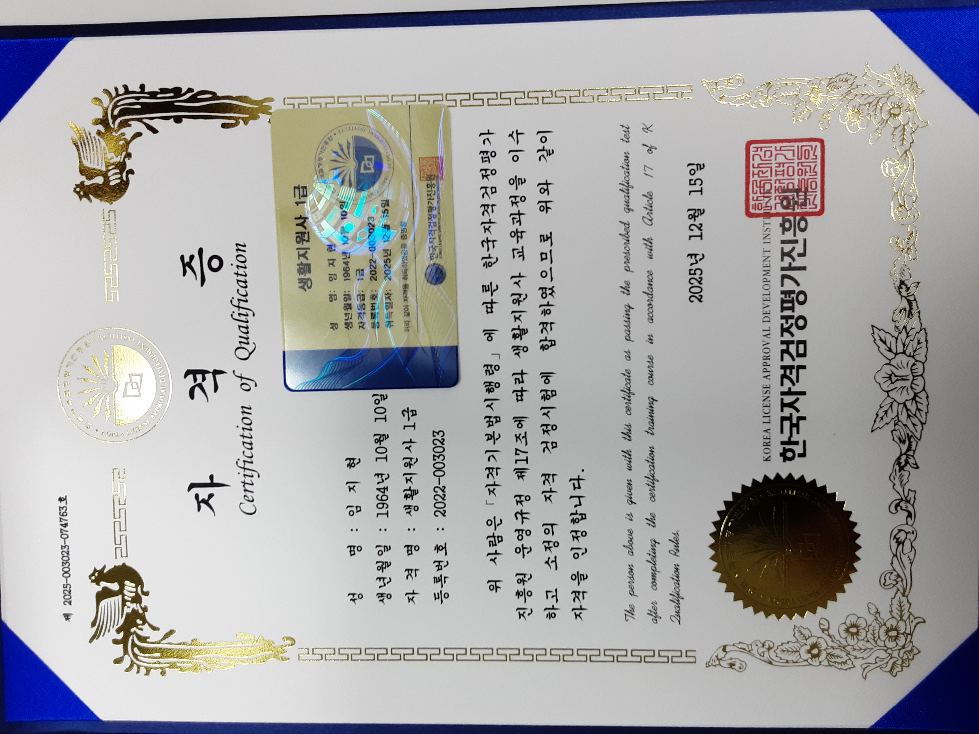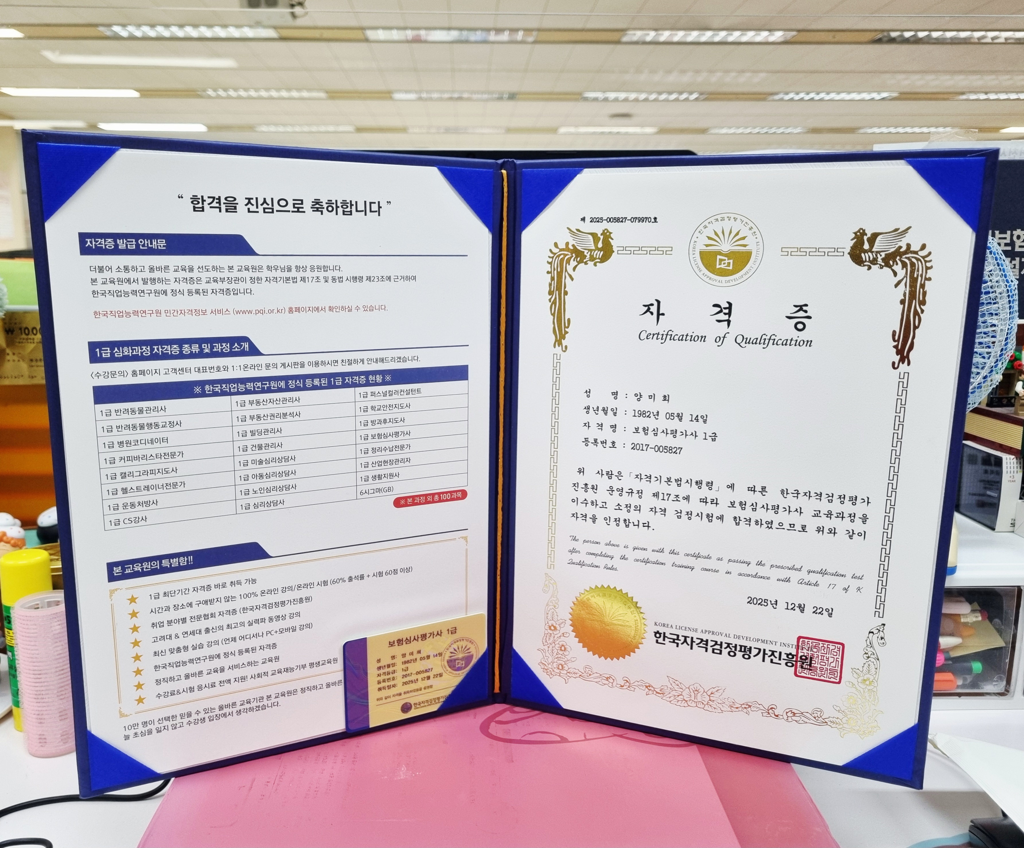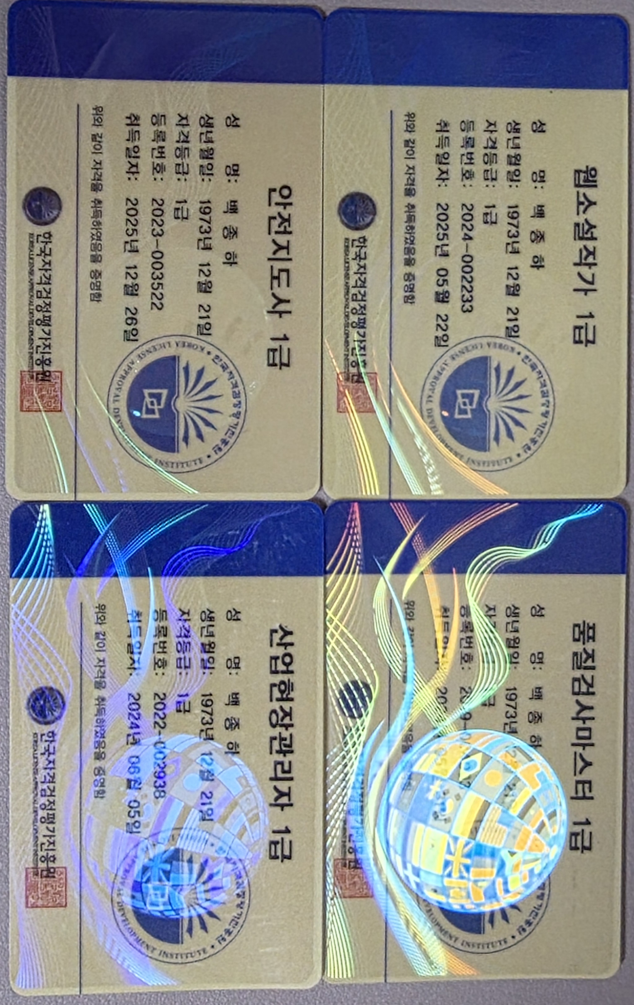 건설 현장에 처음으로 발들 들이고, 적응+배움으로 일관하던 중 품질 관리에 관련한 자격증을 따서 품질관리 과장에서 차장으로 산업 현장 관리자를 따고 "현장 소장"으로 까지 승진을 했습니다. 평소 책 읽는걸 즐기던 저는 언젠가는 "글을 쓰고싶다"는 꿈이 있었는데 웹 소설작가 자격증을 따, 웹 상에서 나름 팬까지 보유한 "웹 소설가"가 되었고 나이가 나이 인지라, 노후 걱정이 없는 안전 지도사 까지 따 놓으니 마음이 든든 합니다. 이제 별개로 "안전"과 관련한 국가 자격증을 준비하려 합니다. 사진에 보이듯, 젊은 나이가 아니지만 누구나 도전하고 누구나 성취할 수 있는 기회라 생각 합니다. "가만히 있으면 땅 일 뿐 이지만, 걸으면 길이 된다"는 말이 있습니다. 지금 걷지 않으면 내일은 뛰어야 한다는 걸 잘 알고 있습니다. 서두르세요....내일은 하루 더 늦습니다 ^^