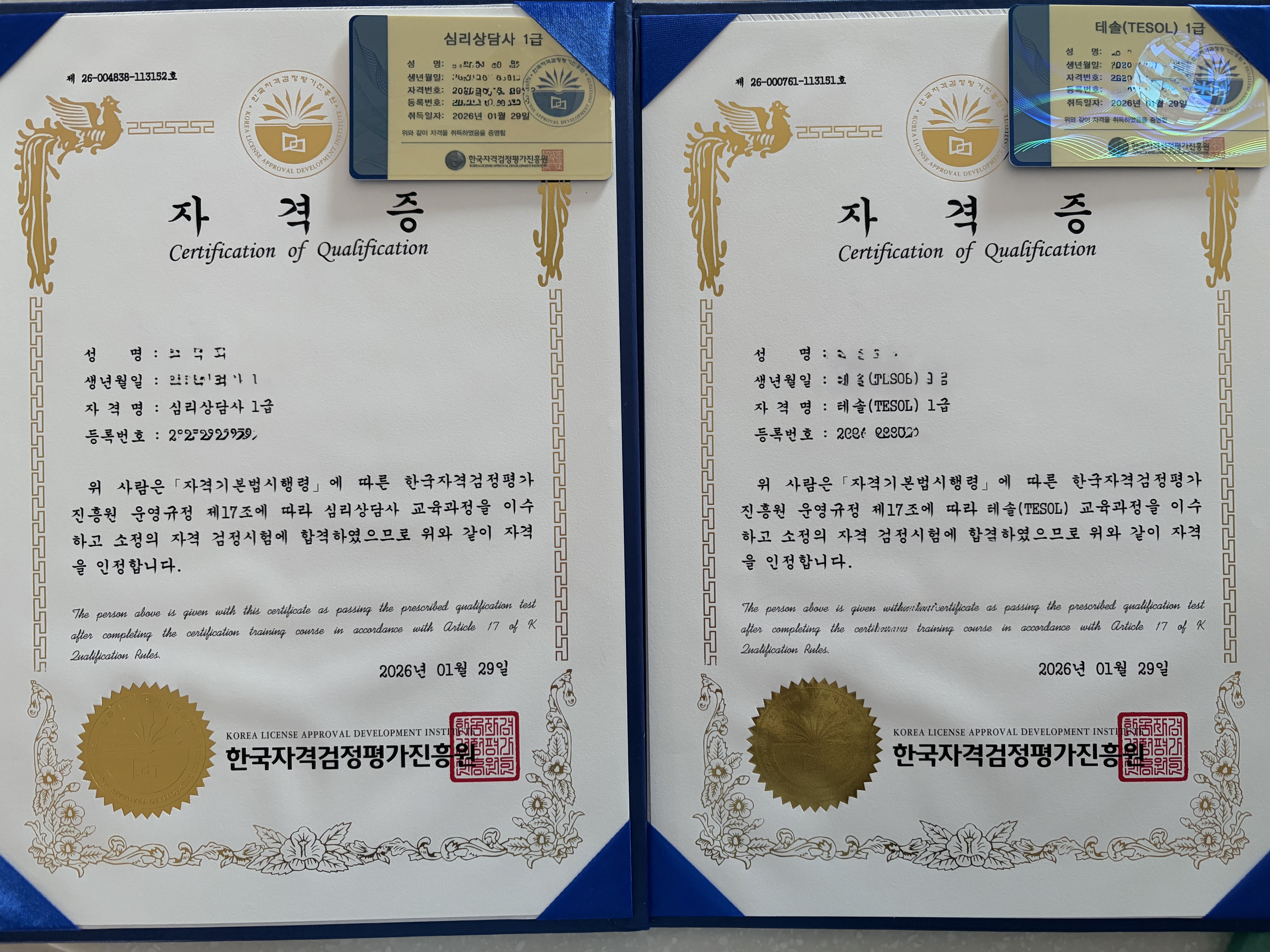 지인추천으로 시작했는데, 또다른 도전을 위한 준비기간이기도 하면서 스스로에게도 유익한 배움의 시간을 갖게되어 뿌듯했습니다. 앞으로도 시간과 정성을 들여서 꾸준히 학습하고 여러자격증에 도전하려고 합니다. 더이상은 학생이 아님에도 배움에는 늦음이 없고 끝이 없어 행복합니다. 모두 화이팅 하세요!!