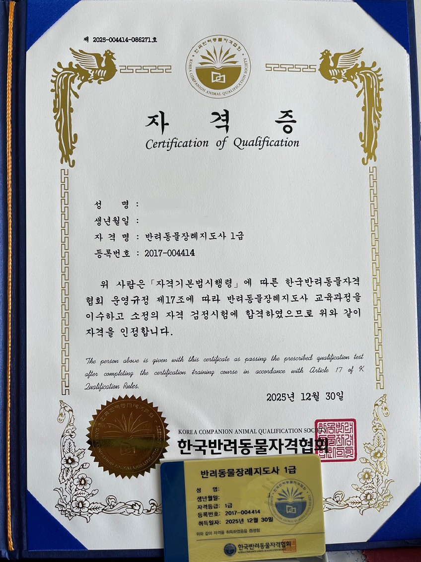 "가장 사랑할 때, 마지막을 공부하다" 우리 집에 온 지 이제 7개월 된 작고 소중한 토이푸들 녀석을 보며 문득 그런 생각이 들었습니다. '이렇게 사랑스러운 이 아이가 언젠가 무지개다리를 건너게 될 때, 나는 당황하지 않고 온전한 슬픔으로 이 아이를 배웅할 수 있을까?' 단순히 슬퍼만 하기보다는, 보호자로서 아이의 마지막 소풍길을 내 손으로 가장 존중받는 방식으로 준비해주고 싶다는 마음이 커졌습니다. 그래서 반려동물장례지도사 1급 도전을 시작하게 되었습니다.(더불어 애견을 사랑하는 마음만이 아닌 지식과 함께 다른 친구들의 장례도 도와주고싶다는 생각도 들어 시작하게 되었습니다.) 자격증을받고 나니, 우리 집 강아지를 보는 마음이 이전보다 더 애틋해졌습니다. 장례지도사 공부는 아이의 죽음을 준비하는 시간이 아니라, 아이의 남은 견생을 더 가치 있게 사랑해줘야겠다는 다짐을 하는 시간이었습니다. 이제는 내 아이뿐만 아니라, 예상치 못한 이별로 슬픔에 잠긴 다른 보호자분들에게도 전문적인 지식과 따뜻한 위로를 전할 수 있는 준비가 된 것 같아 뿌듯합니다. 이별은 슬픈 일이지만, 그 마무리가 아름답다면 슬픔은 곧 소중한 추억이 될 거라 믿습니다.