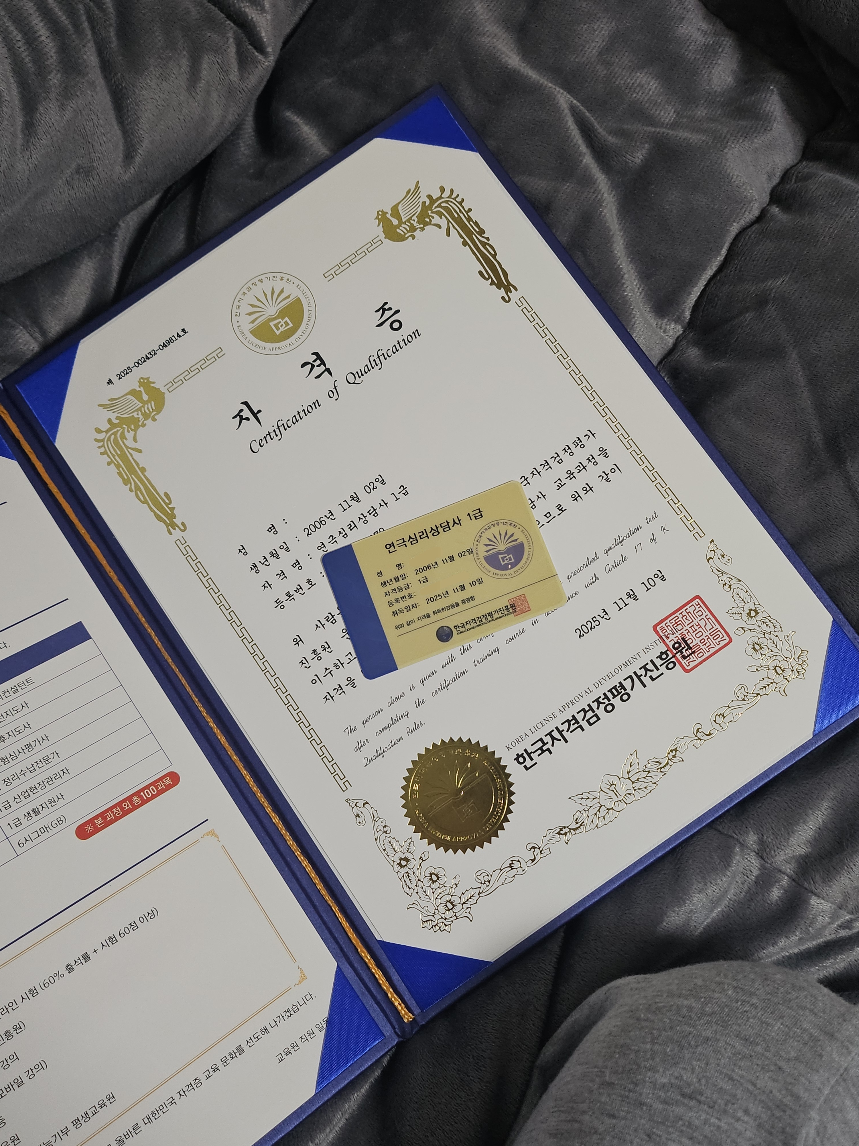 배움에는 끝이 없다는 말을 실감하게 된 시간이었습니다. 첫 자격증 취득 후에도 스스로의 성장을 멈추고 싶지 않아 다시 한 번 도전에 나섰습니다. 처음 공부를 시작할 때는 새로운 분야에 대한 부담감도 있었지만, 강사님의 체계적인 강의와 실질적인 예시 덕분에 점차 자신감을 얻을 수 있었습니다. 특히 강사님의 친절한 설명과 이해하기 쉬운 강의 구성은 학습 과정의 큰 힘이 되었고, 바쁜 일상 속에서도 꾸준히 공부할 수 있는 원동력이 되었습니다. 때로는 지치고 포기하고 싶은 순간도 있었지만, “시작이 곧 성장의 증거”라는 마음으로 끝까지 최선을 다했습니다. 그 결과, 또 한 번의 합격 소식을 들었을 때의 기쁨은 말로 다 표현할 수 없었습니다. 이번 경험을 통해 배움의 즐거움과 성취의 소중함을 다시금 느꼈고, 앞으로도 계속 새로운 도전을 이어가고 싶습니다. 이 귀중한 기회를 통해 성장할 수 있도록 이끌어 주신 한국자격검정평가진흥원에 진심으로 감사드립니다.