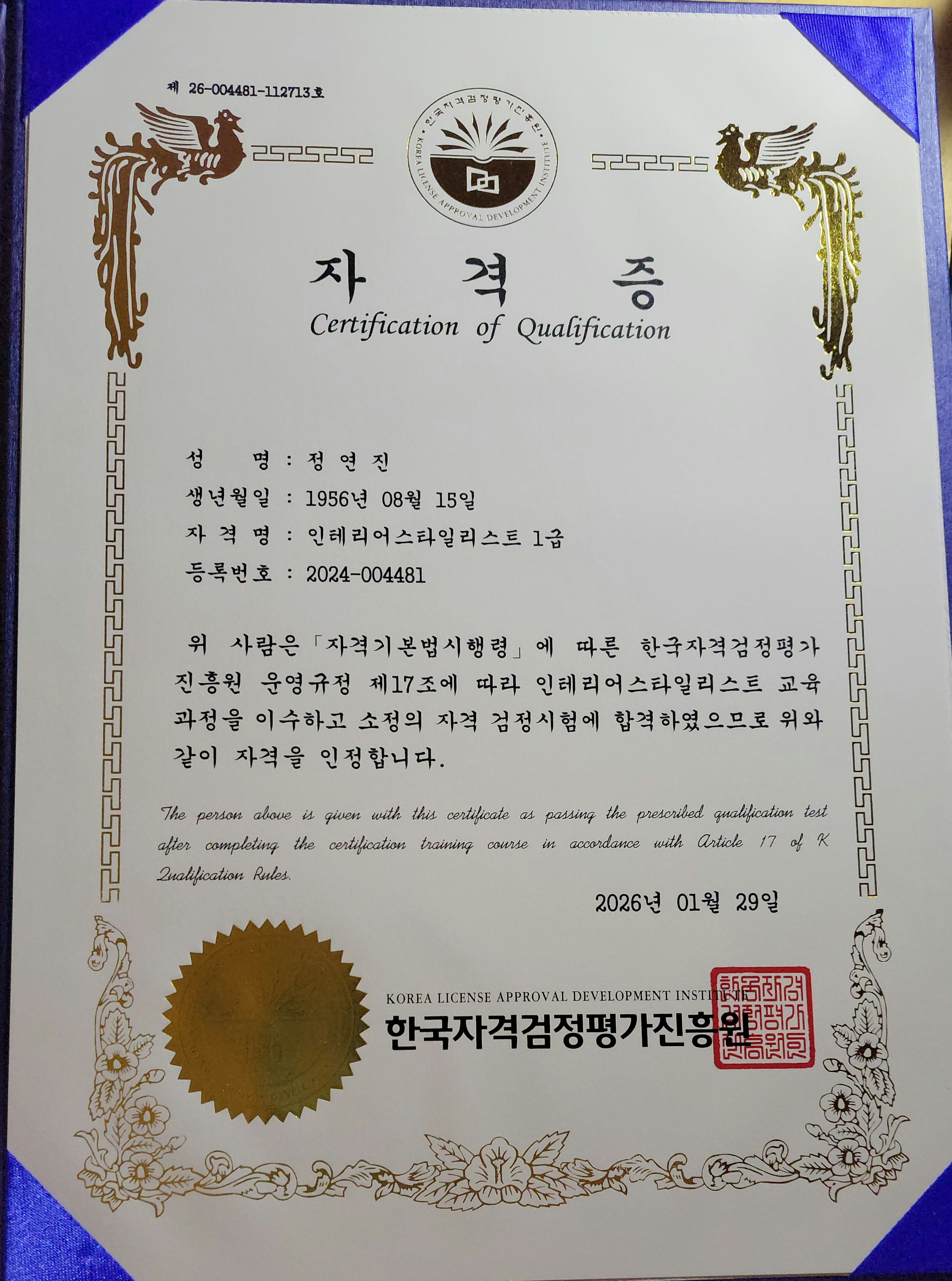 인테리어스타일리스트1급 자격증에 도전하여 합격하였습니다