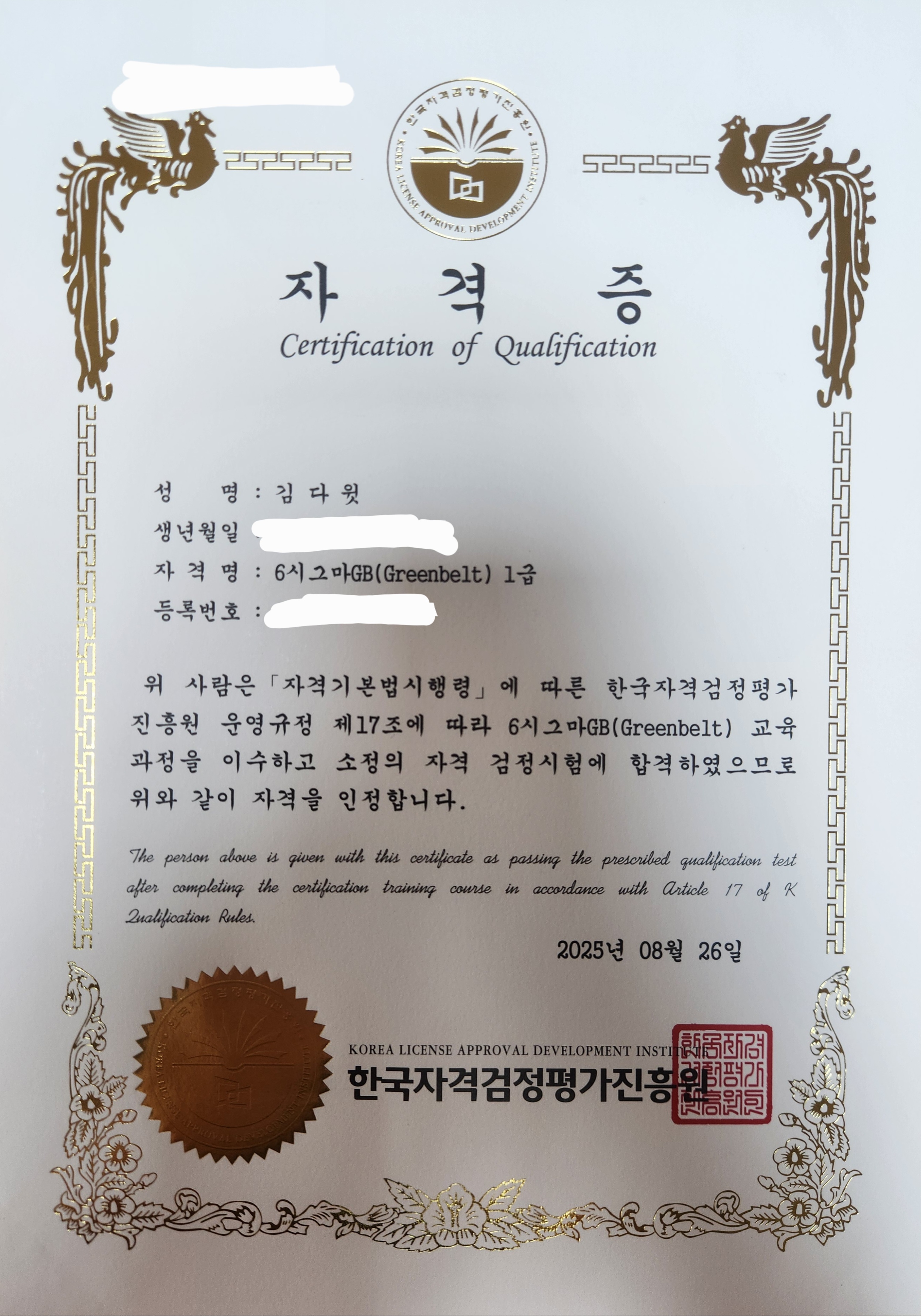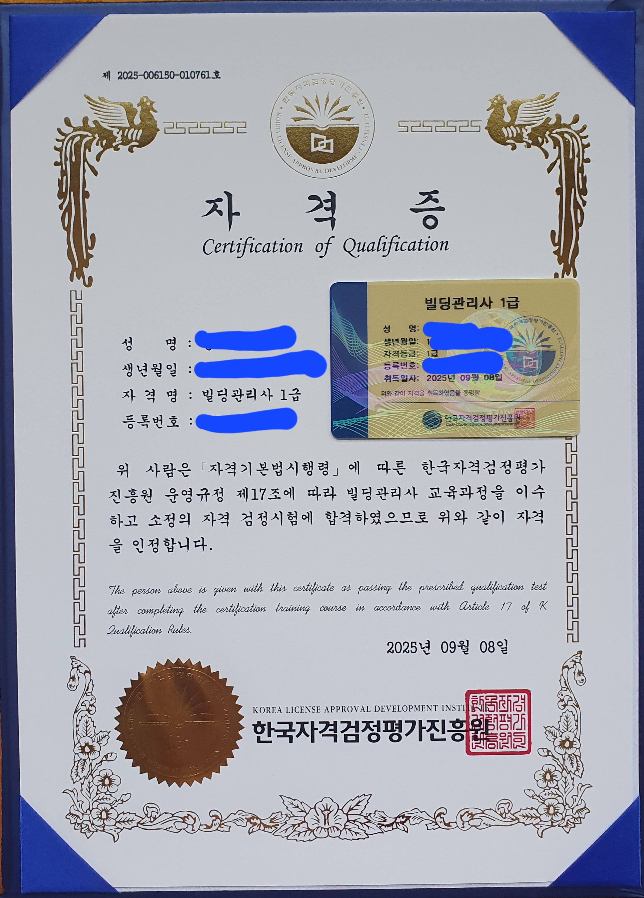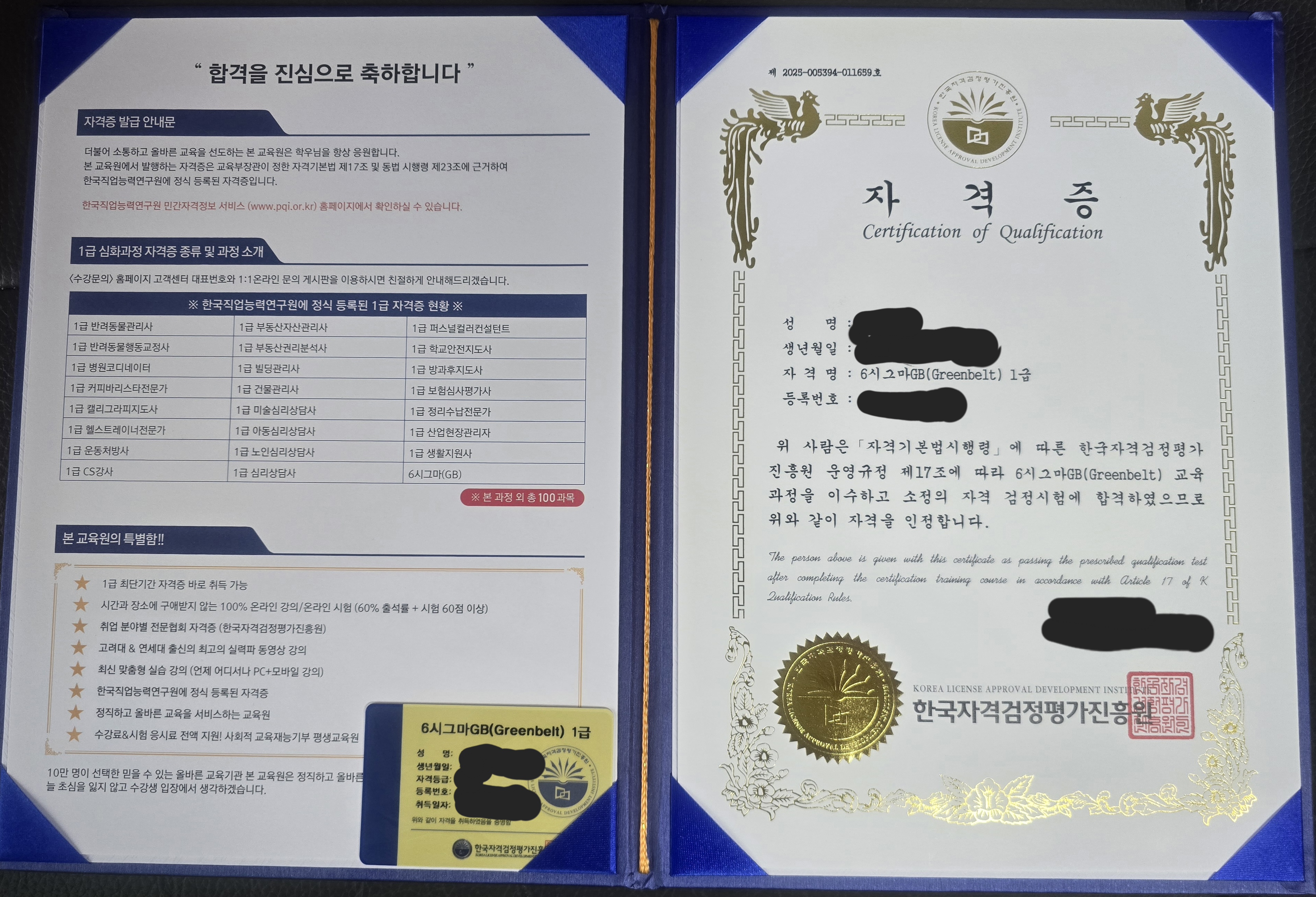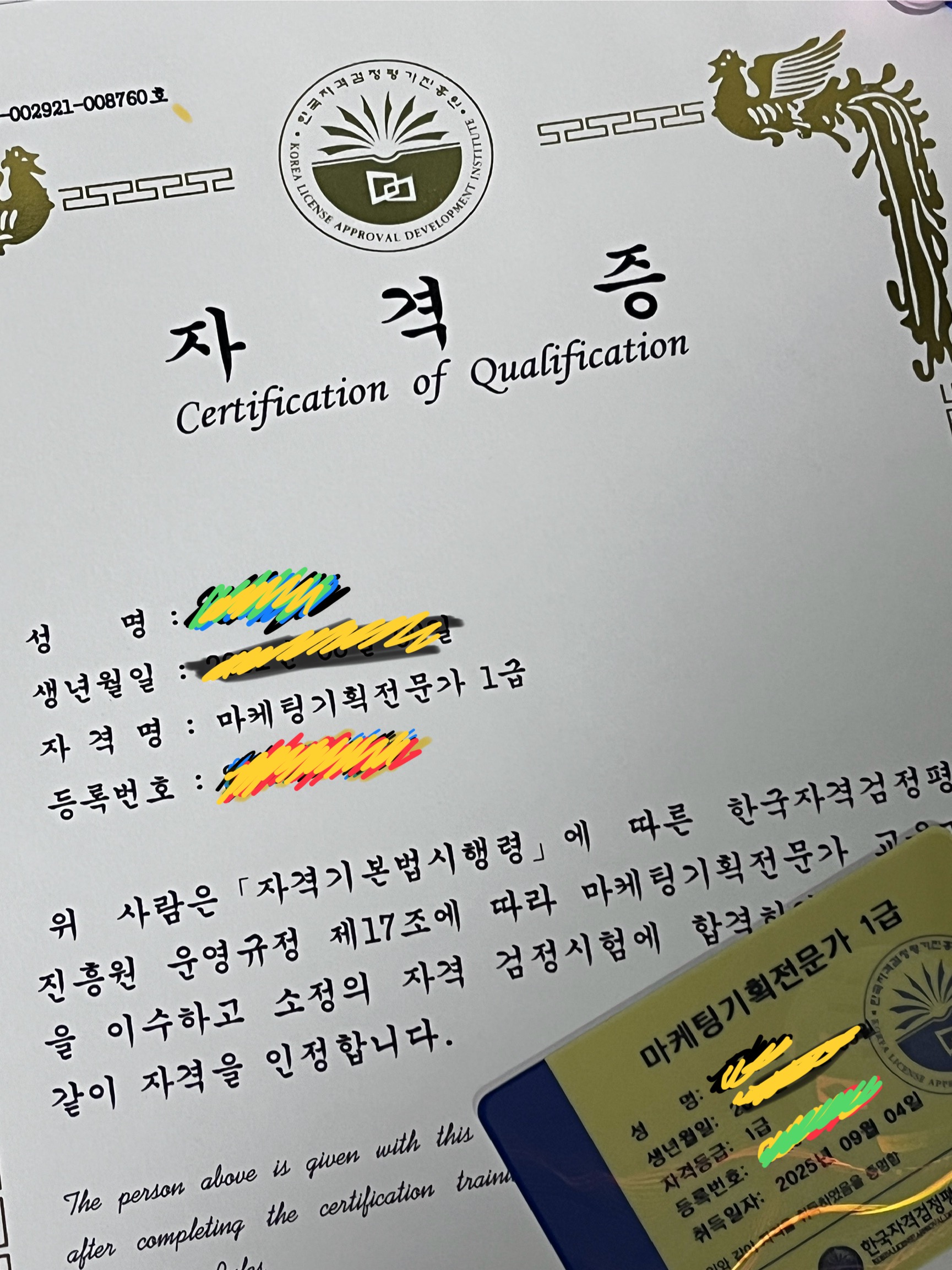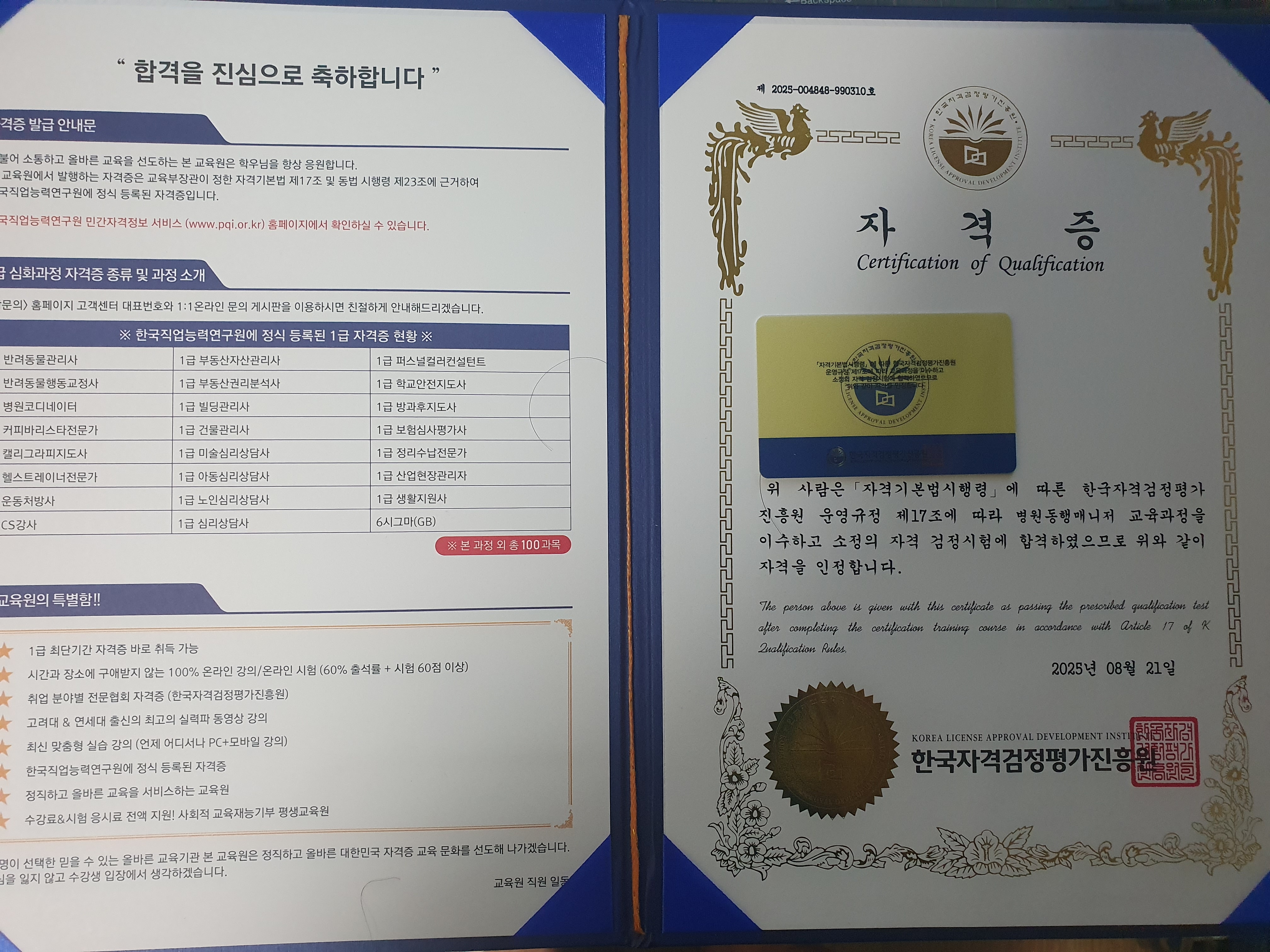 집중력도 짧고 공부라곤 싫어하던 제가 이렇게 자격증까지 딸 수 있었던건 전부 한국자격검정평가진흥원 덕분입니다. 알기 쉬운 설명 짧은 강의동영상(30분 내외)으로 공부에 도움을 주신 교수님께도 감사드립니다