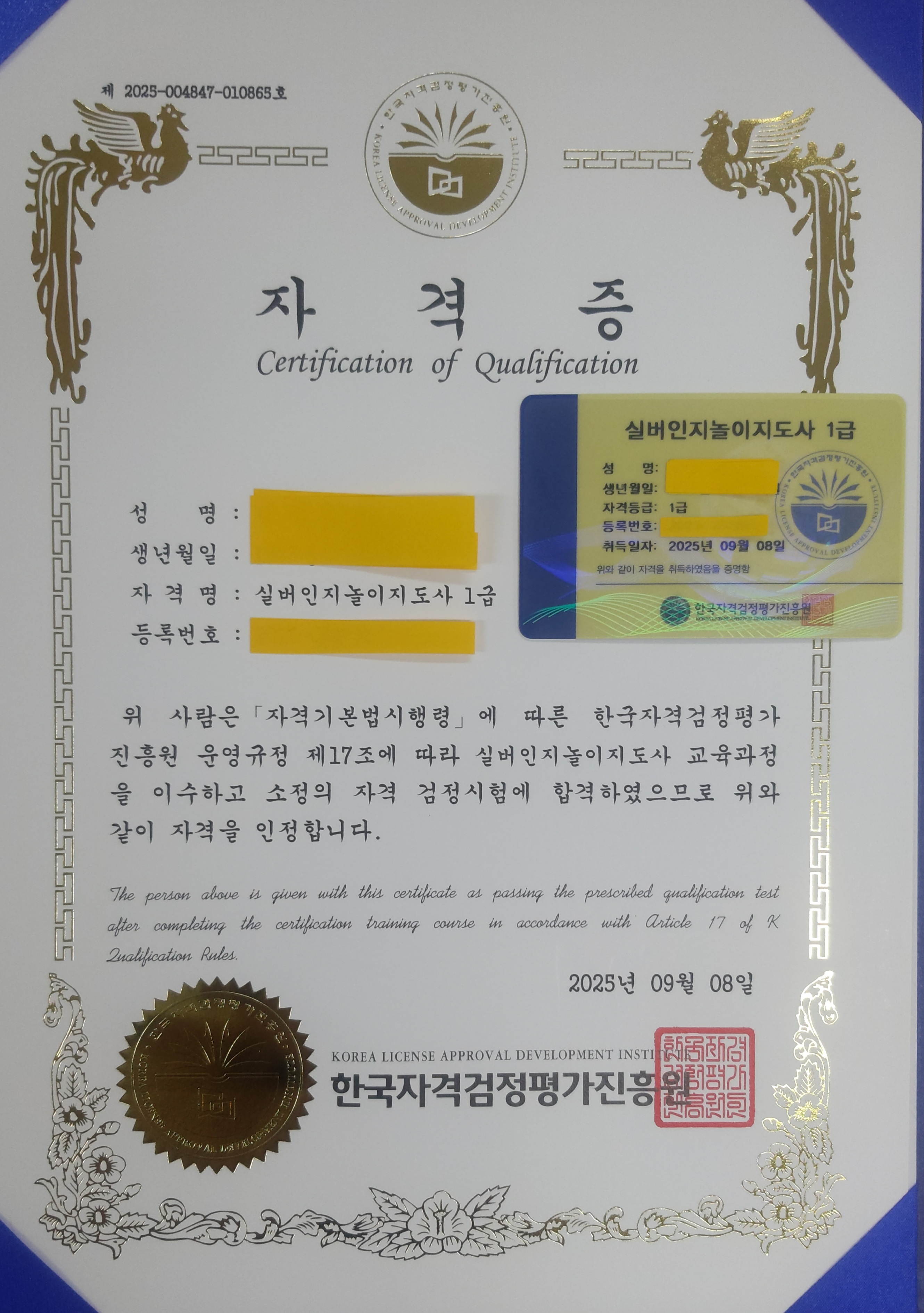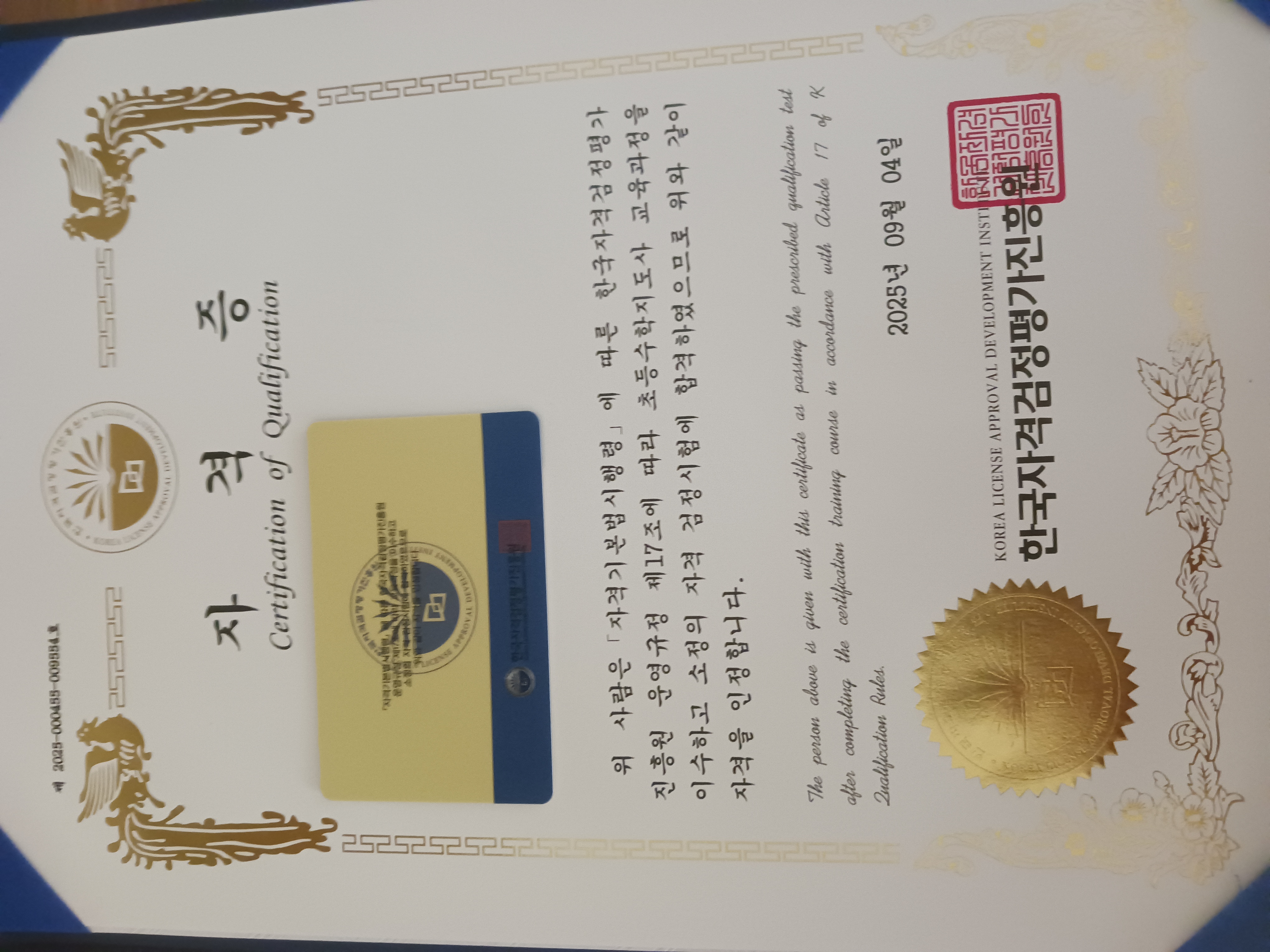 현재는 직장에 다니고 있지만 회사 사정이 어려워 곧 폐업할 예정인데..아직은 경제활동을 해야되는 상황에 무슨일을 해야할까 고민하던중, 지인 추천으로 알게되어 자격증 취득의 기쁨까지 얻을수 있게 해주신 기관과 교수님께 감사의 말씀 드립니다. 다가올 불확실한 미래를 위해서 조금 더 선명하게 여기에서 여러분도 저처럼 도전해보세요.모두 화이팅! ^^. ~~