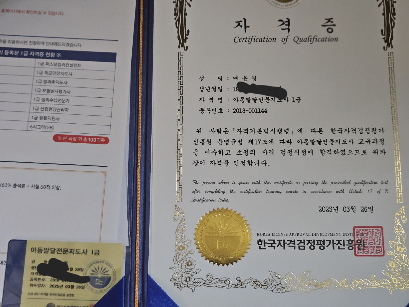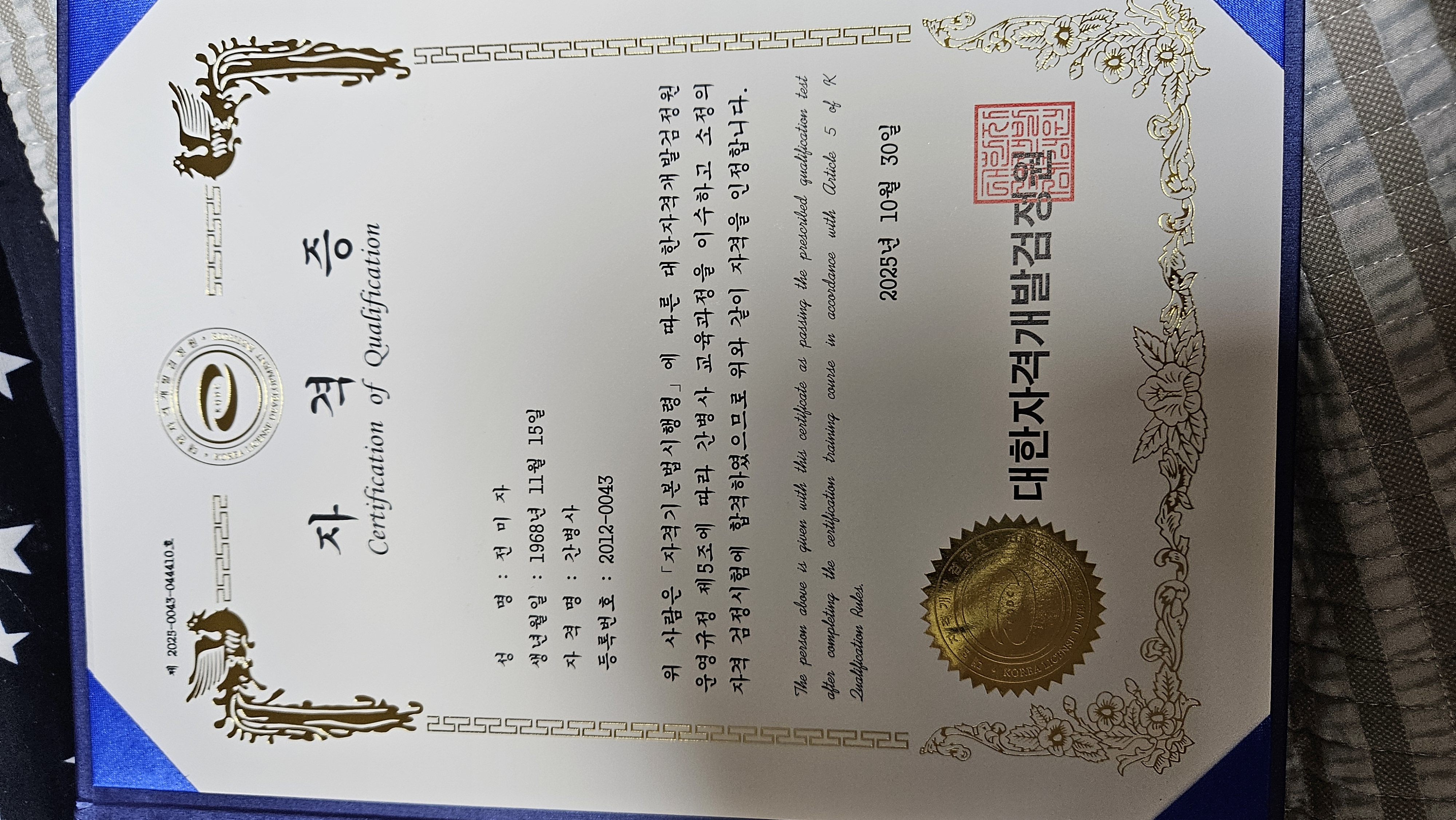 아이들을 가르치고 있는데.. 좀더 공부하고 싶어서 신청을 했어요... 우리 자식들은 다 성장했지만 다시 경험과 배움을 통해 도움이 되었어요..자격증을 받고나니 더 뿌듯하네요..