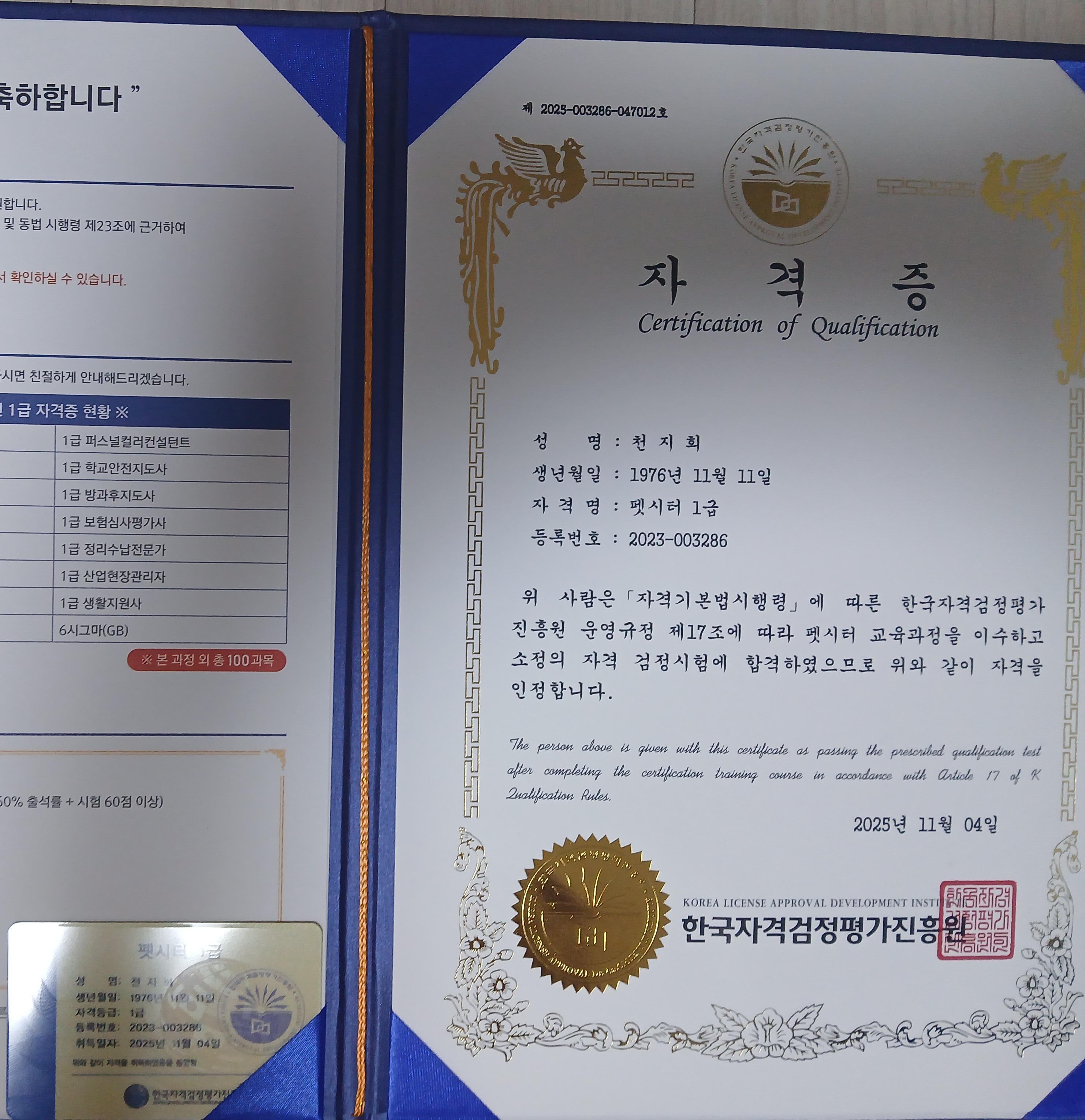 이제 당당히 그 꿈을향해 다가갈수 있을 것 같습니 다. 합격기쁨은 말로다할 수 없구요 이 자격증이라 면 펫시터로써 새 출발하 기에는 충분하다 생각생 각듭니다 그 기회의문을 열어준 검정평가 진흥원 너무 감사드립니다.