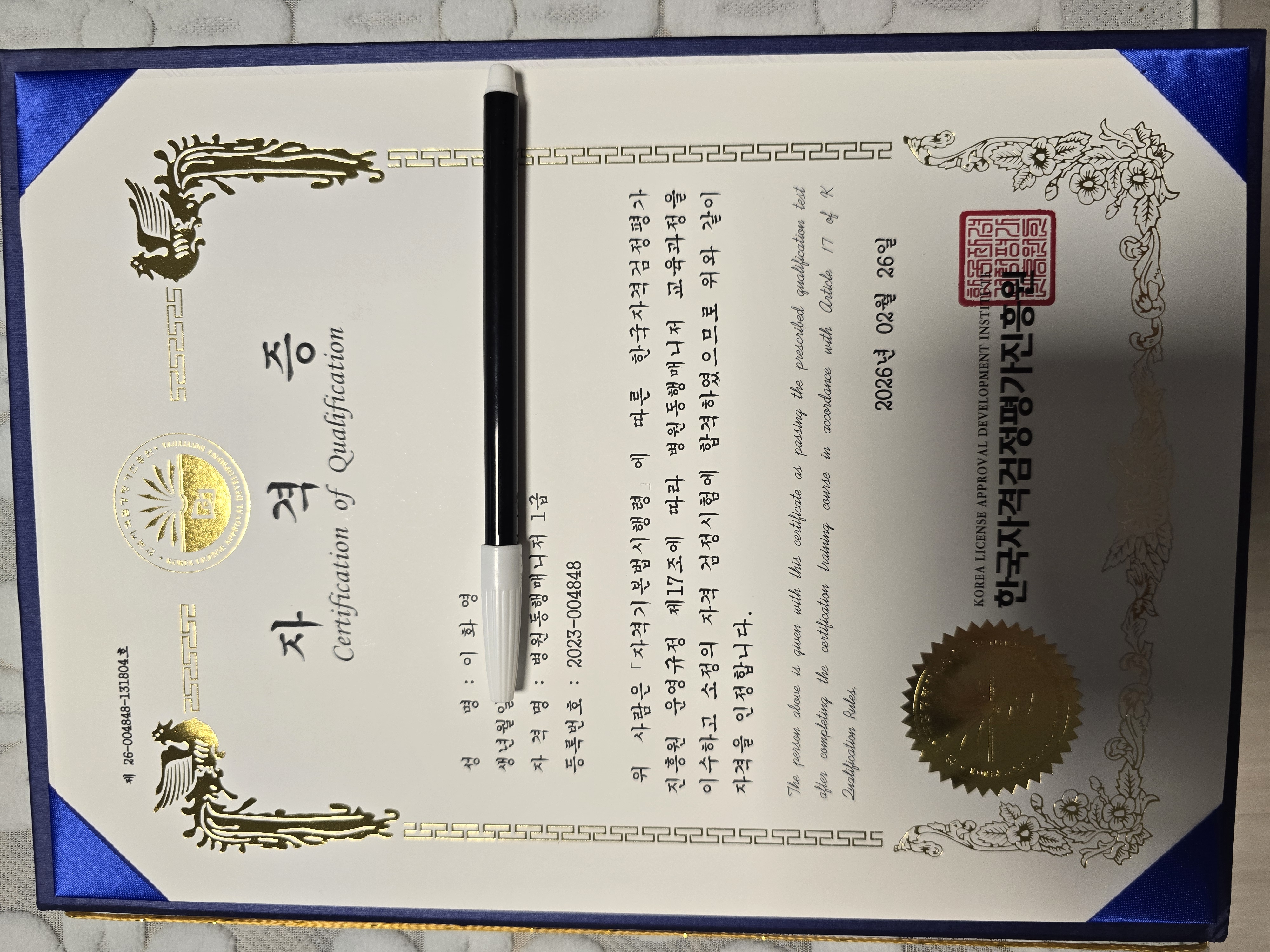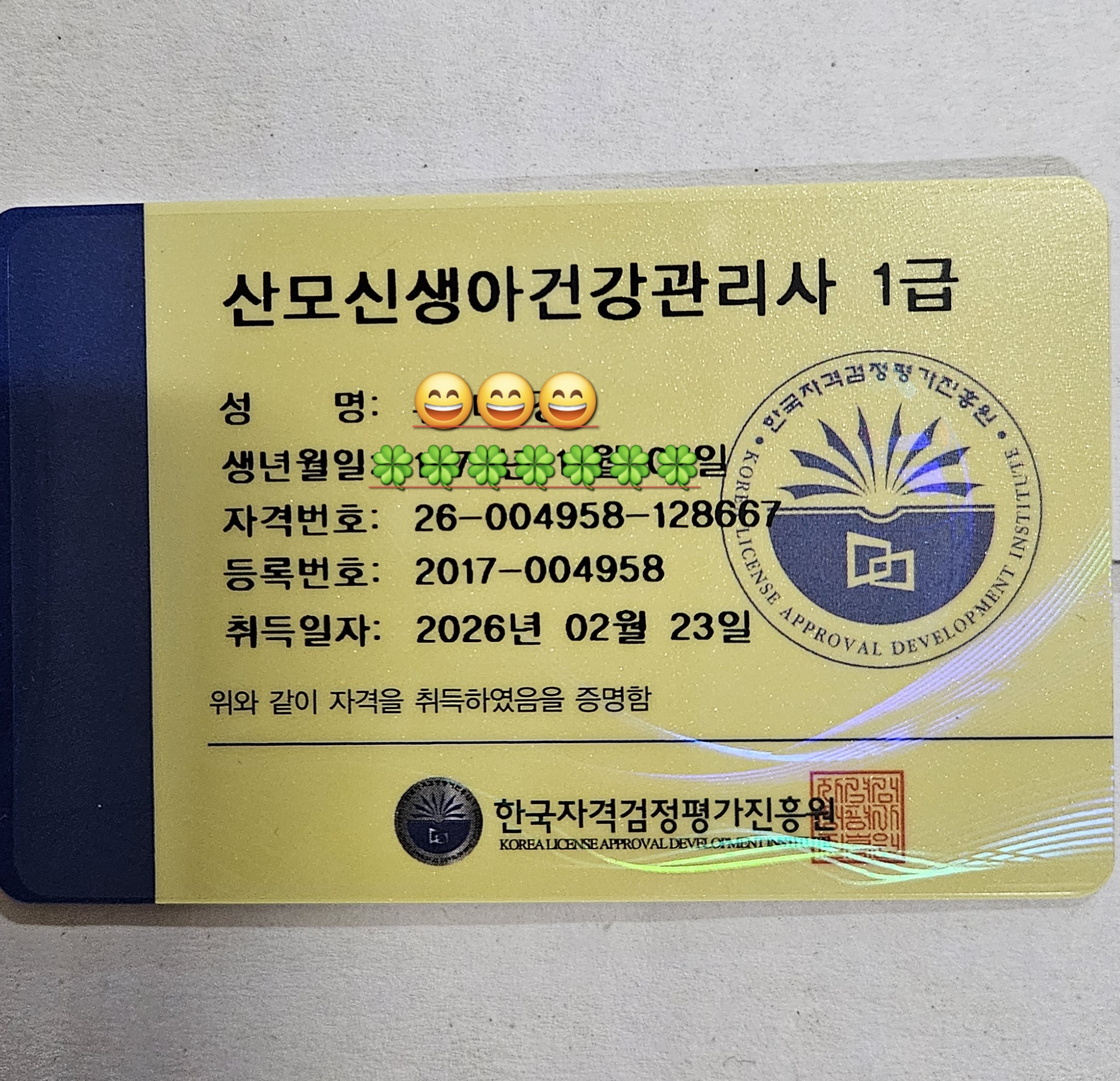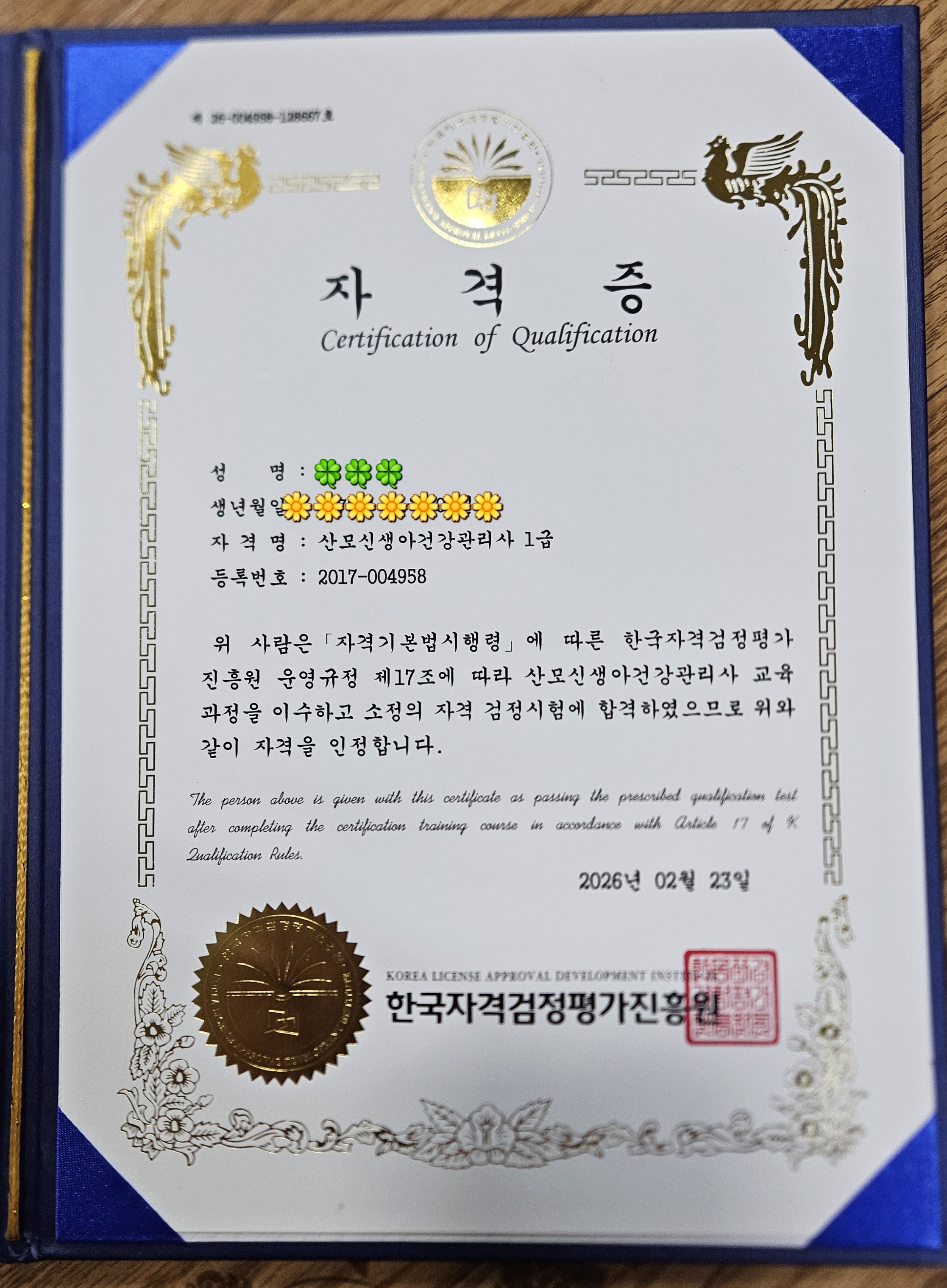 한국자격평가진흥원과 산모신생아관리사 자격증은 지인분 소개를 받았어요. 나이 상관없이 초보자도 가능하고 사회가 Al 시대라도 신생아케어는 사람이 직접 해야하는 유망직업이라고 사회복지시설, 신생아관리사로 근무 가능하다고 자격증취득 후 유망직종이라며 온라인 강의만 들어도 합격할 수 있다고 설명 듣고 도전했어요. 강의들으면서 매일 매일 설명도 자세하게 해 주시고 도전하길 잘했다, 재미있게 듣고, 시험절차도 편리하고, 즐겁게 배웠습니다. 자격증 받고 딸들에게 엄마도 새인생 시작이다! 자랑도하고 앞으로 손자손녀에게도 도움되고 설레고 자격증 받고 내나이에도 새롭게 시작할 수 있다는 도전에 눈시울이 울컥했습니다. 도와주신 한국자격진흥원에도 고맙고 감사합니다.