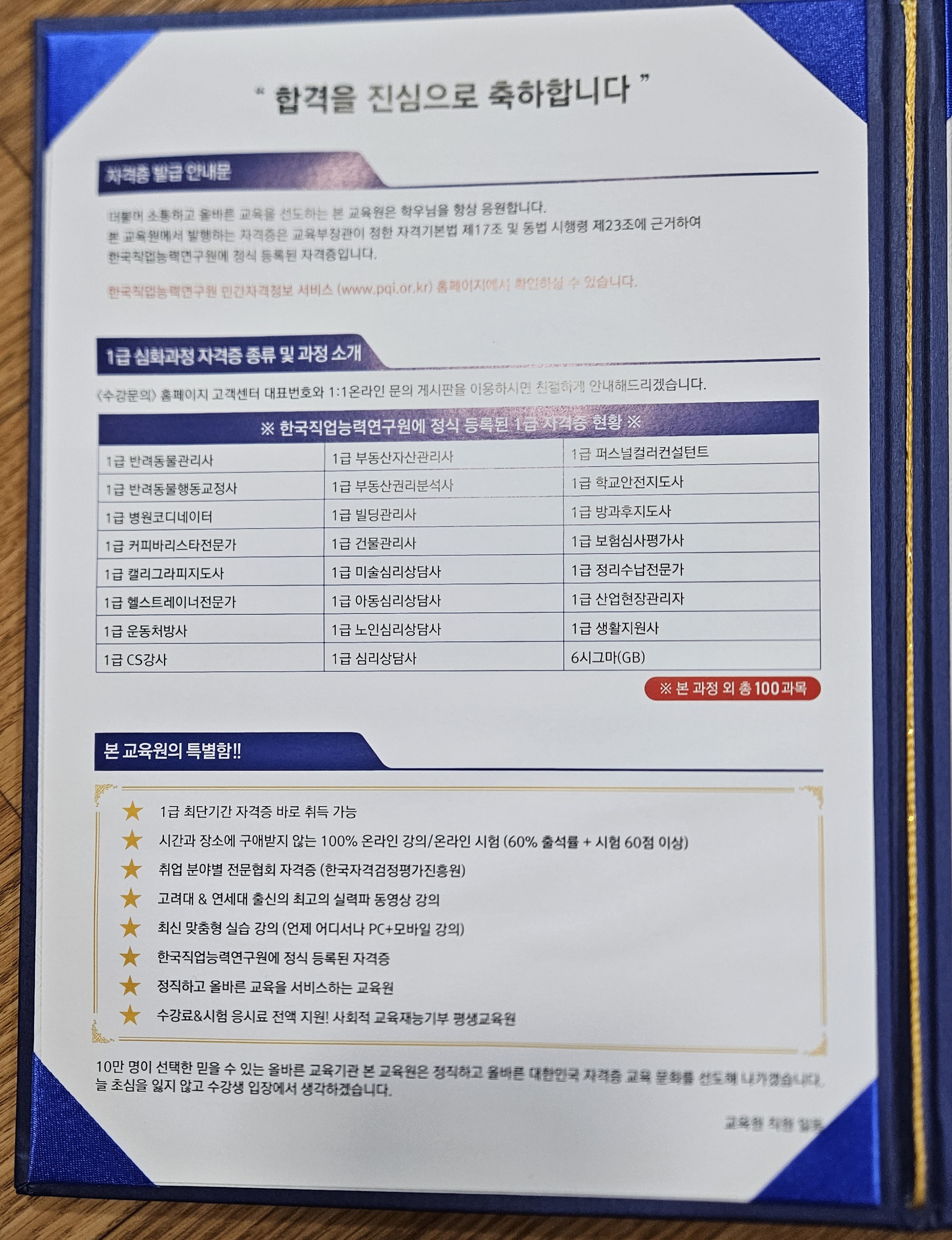 사회복지과 전공을 앞두고 있는 만학도 입니다. 심리상담 과 실버 심리치료 전반 자격증을 취득 하면서 뿌듯하고 많은 정보를 미리 익혀서 든든함을 느낍니다. 지인 소개로 알게되서 간단히 하나만 취득 하려고 했다가 지금은 6개 과정의 심리 자격증을 취득 했습니다. 시간 날때마다 강의 들을 곳이 있다는 것이 행복합니다.
