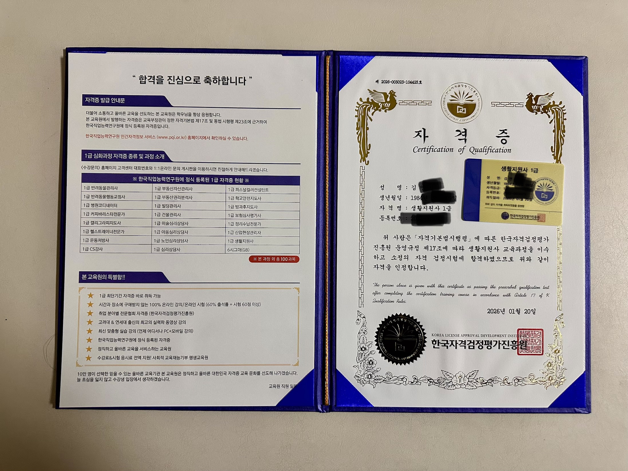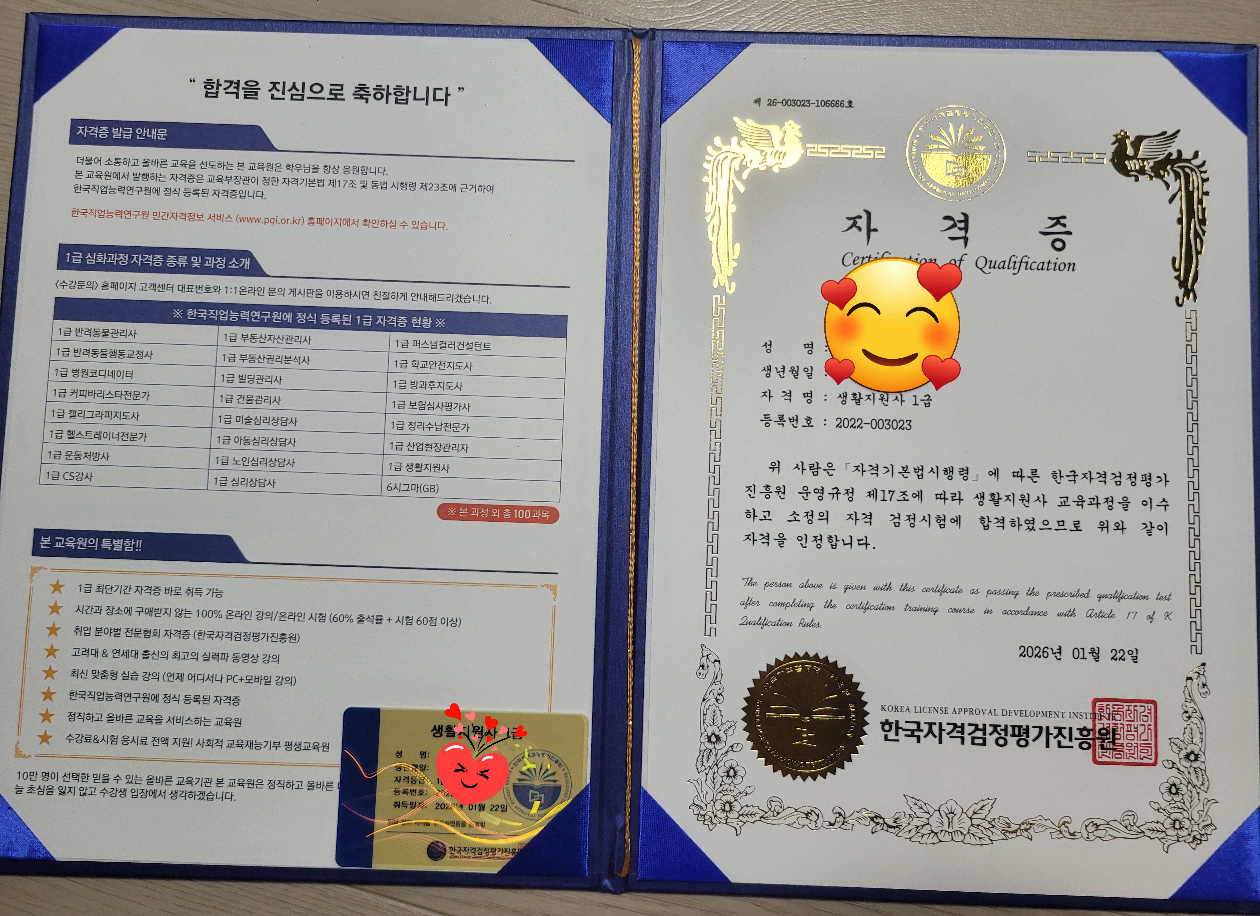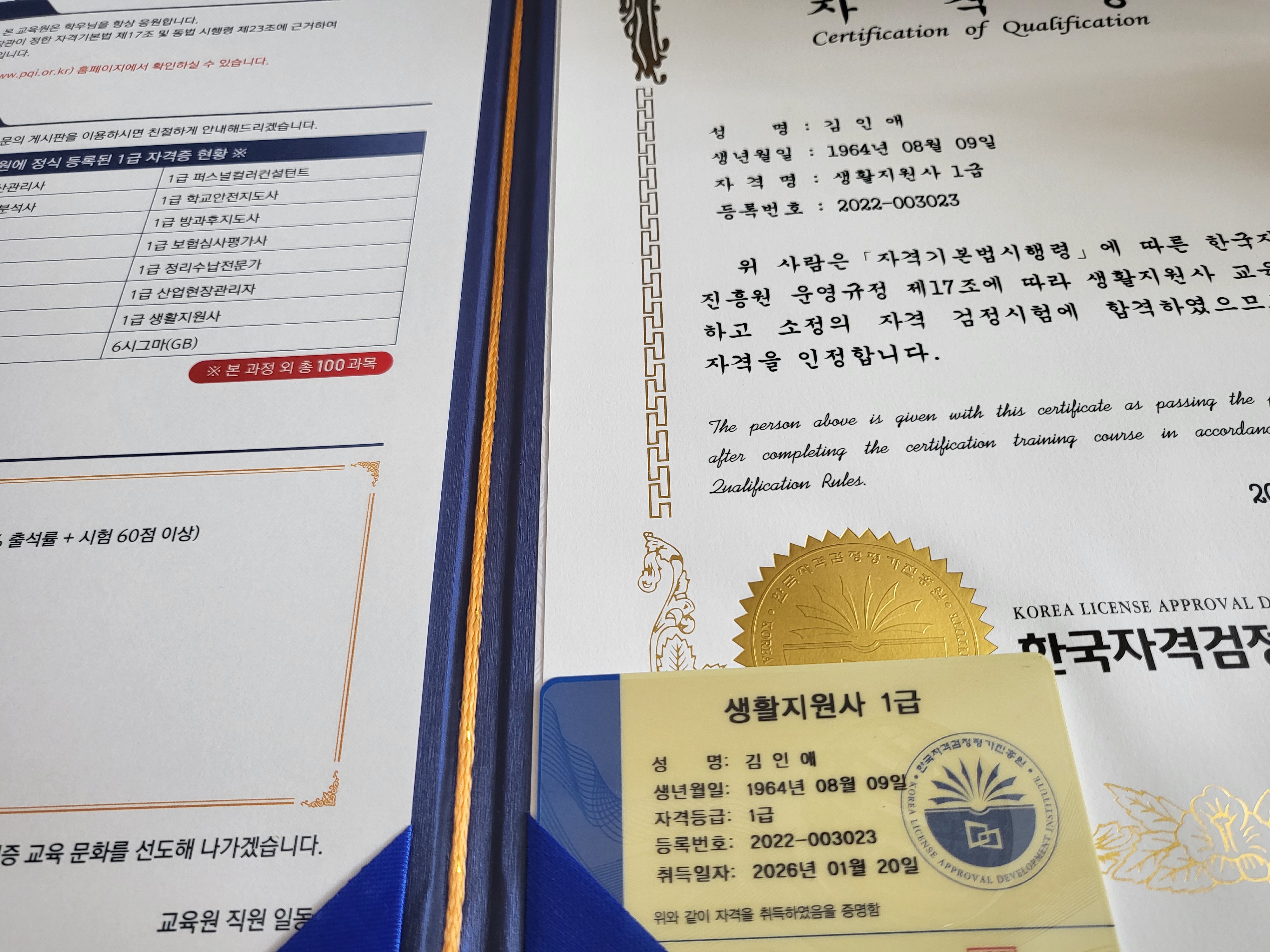 용기를 얻어서 또 공부를 해서 두번째 생활지원사 자격증을 땄습니다. 제 자신이 넘 기특합니다. 자기 개발하기 위해 또 도전하겠습니다. 넘 고맙습니다 ♡